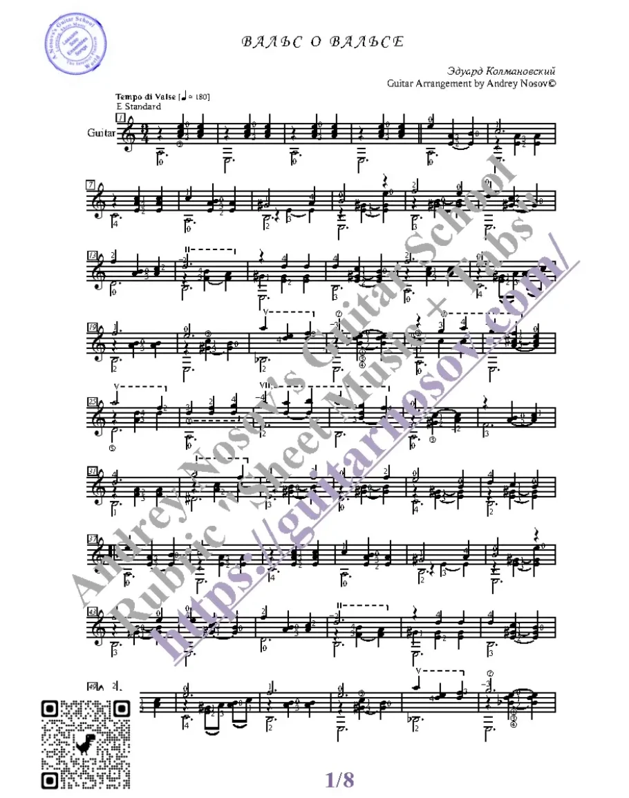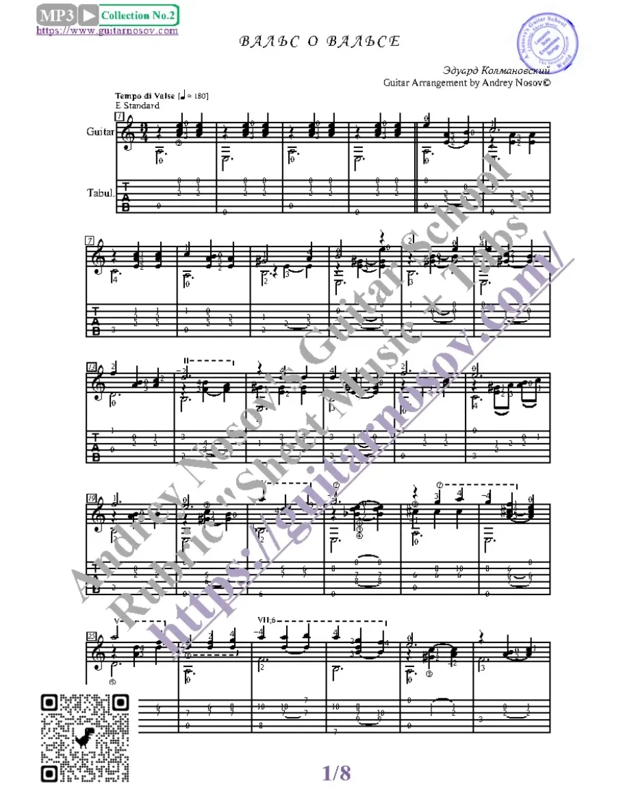Кликните "Подробнее" для получения дополнительной информацииВашему вниманию предлагается композиция "Вальс о вальсе (Э.Колмановский)", предназначенная для исполнения на 6-ти струнной гитаре СОЛО. Запись выполнена нотами, сопровождена подробнейшей аппликатурой и продублирована табулатурой. И ещё...