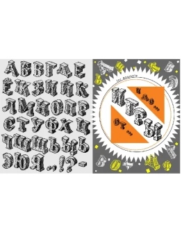 Кириллический алфавит, азбука, состоящая из букв разного размера и формы, которые нарисованы в стиле..