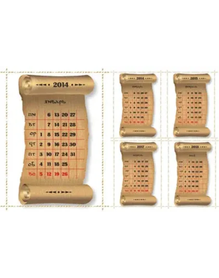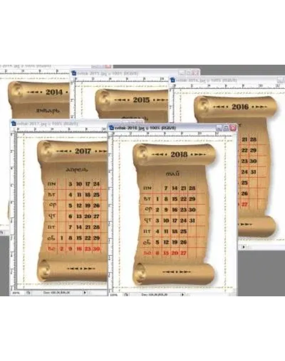 Календарь на свитке, помесячно, с векторными сетками всех месяцев на пять лет: 2014, 2015, 2016, 2017, 2018 гг. Файлы psd со всеми месяцами на отдельных слоях, а также векторные сетки в eps и cdr (с возможностью редактирования шрифта). Разрешение растровых psd файлов 400 dpi. Большинство слоев выключено!