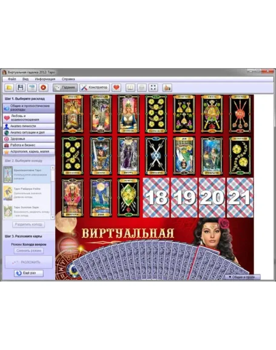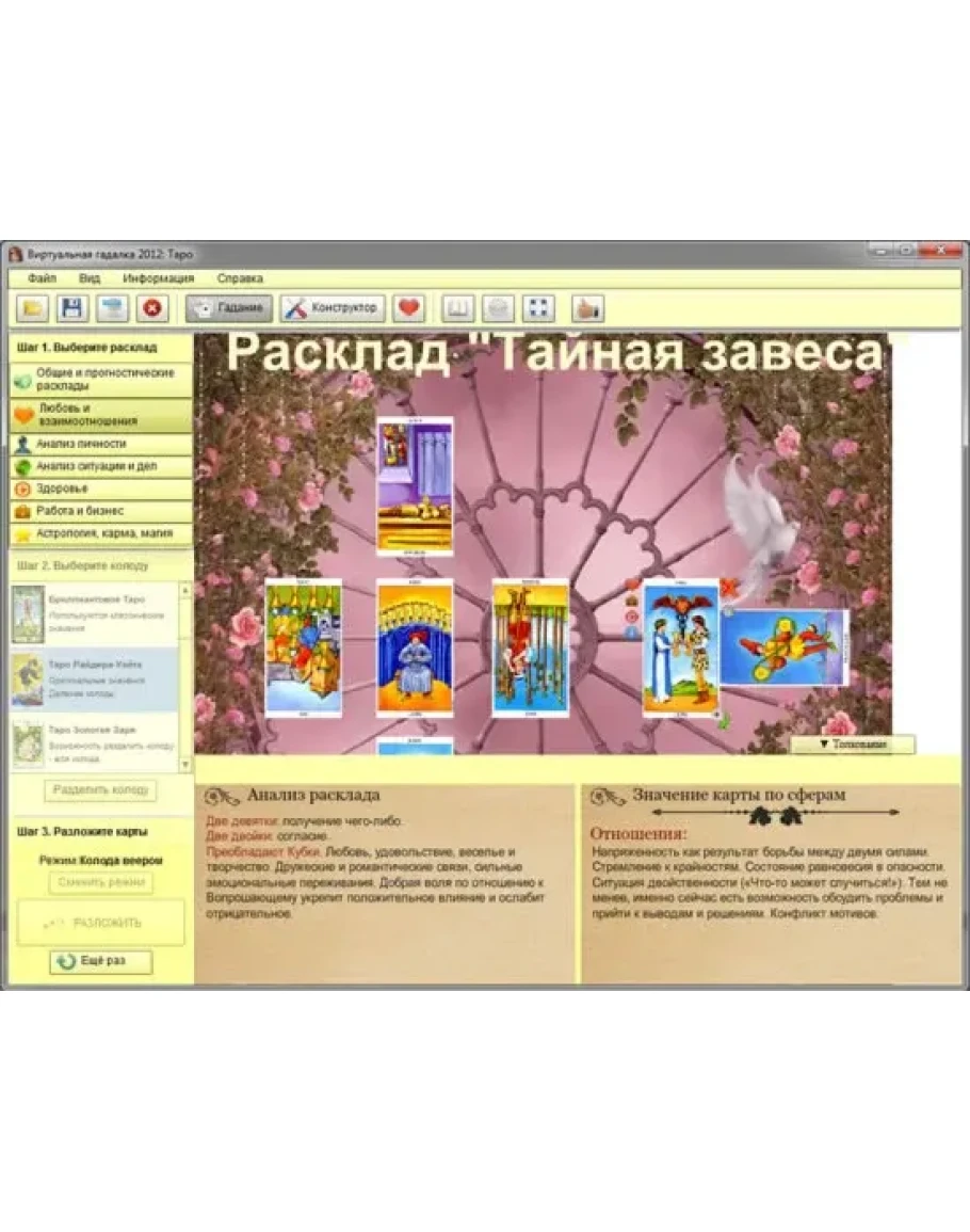 Самый удобный инструмент для получения предсказаний с помощью карт Таро, виртуальных гаданий на Таро, обучению гаданиям на картах Таро и ежедневной практики как для новичков, так и для профессиональных тарологов.
