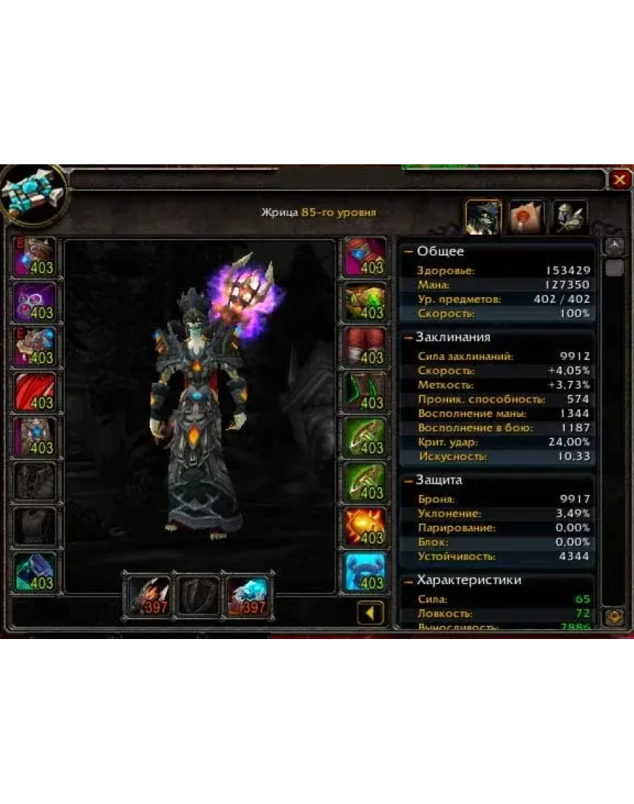 Жрица нежить (Ж) ПВП: 402 илвл. ШП и ДЦ фул арена. Профы: Наложение чр 525 и портняжное дело 525.