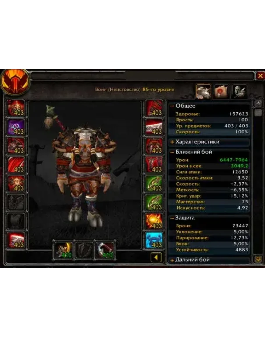 Воин таурен (Ж) ПВП: 403 илвл. фул арена, оружие элитка за 2200 3х3. Профы: Алхимия 525 и Травничество 525.