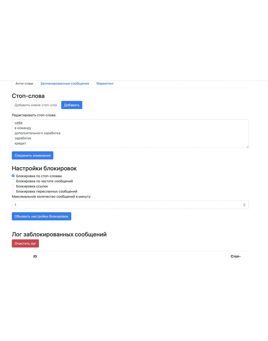 • Блокировка по стоп-словам — бот автоматически удаляет сообщения, содержащие заранее настроенные ключевые слова.