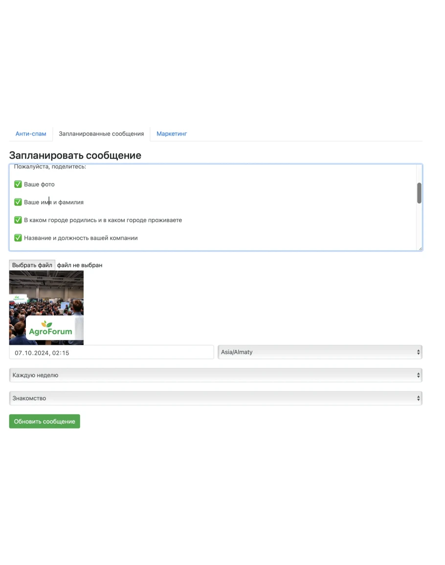 Телеграм-бот: анти-спам, планировщик постов и чат-бот