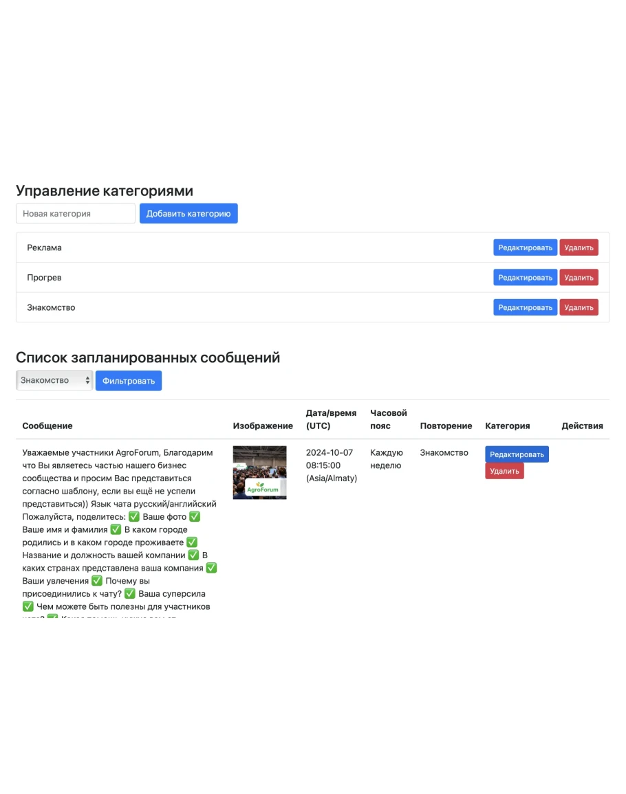 • Категоризация сообщений — создавайте категории для запланированных публикаций, чтобы легко управлять различными типами контента.