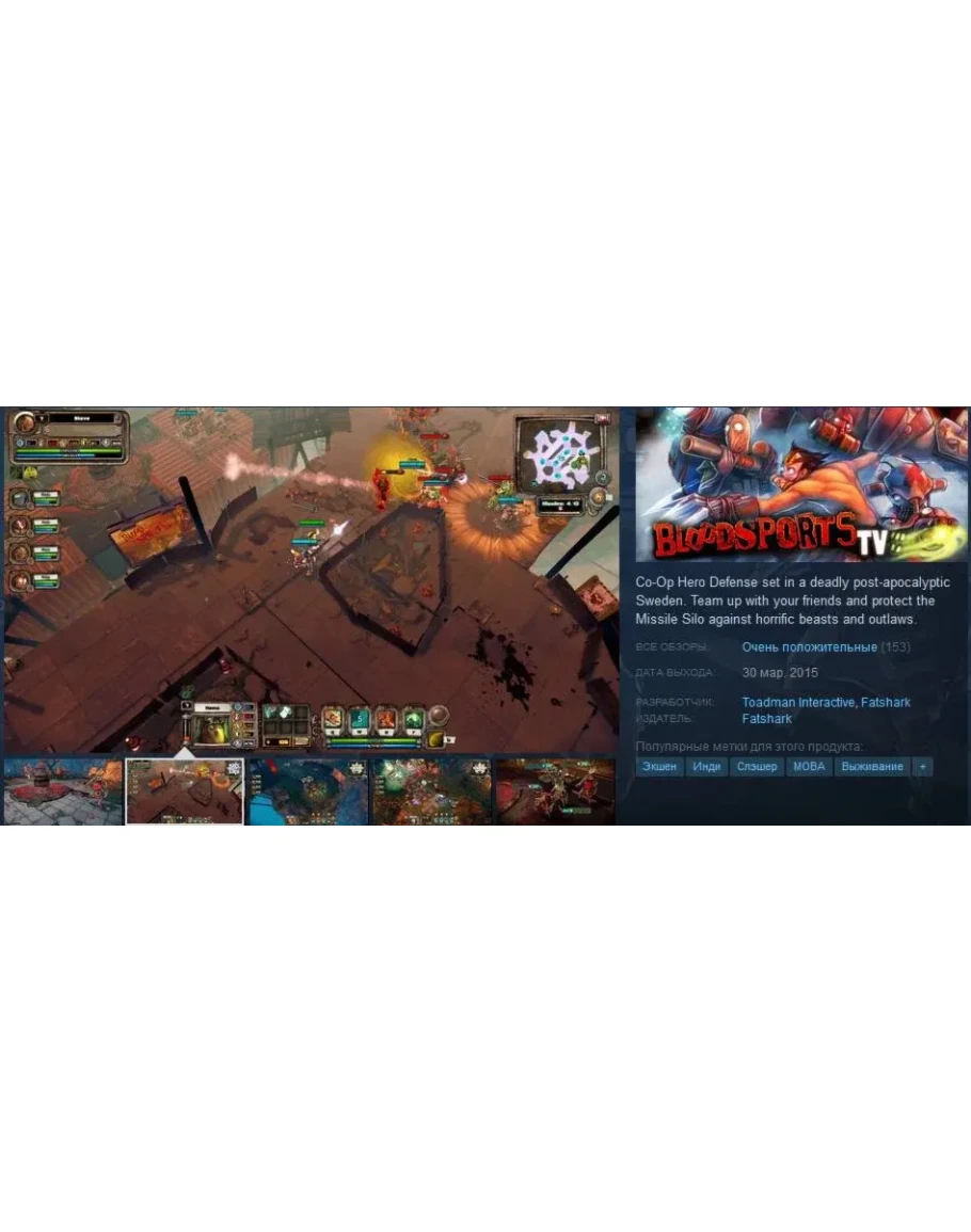 "Bloodsports.TV - это кооперативная игра в защиту героя сверху вниз. В этом спин-оффе, объединяйтесь со своими друзьями и сформируйте убийственную команду из множества гладиаторов, каждый из которых обладает своими уникальными способностями и стилями. Стреляйте, разбивайте, топчите, убивайте электрическим током, истощайте и расплавляйте своих врагов (а иногда и исцеляйте своих союзников), чтобы стать легендарным гладиатором. Набирайте более высокие баллы и поднимайтесь в глобальных рейтингах вместе со своими друзьями, чтобы стать величайшей командой гладиаторов в мире.