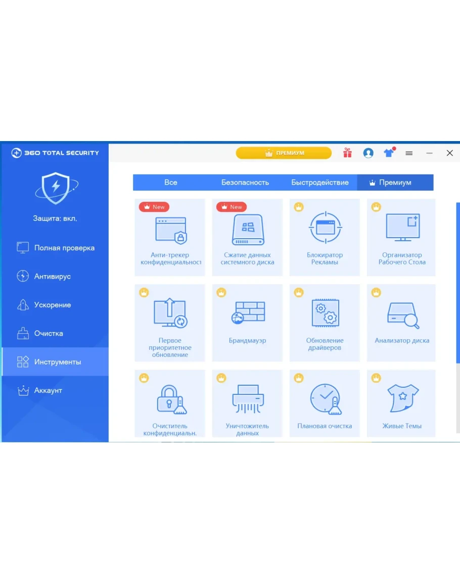 360 Total Security Premium — зарекомендовал себя, как мощный защитник информации и железа миллионов пользователей по всему миру. Дружелюбный интерфейс — даже школьник легко может разобраться в настройках и управлении. Многозадачный — выполняет сразу три функции: работаем как антивирус в штатном режиме, ускоряет и оптимизирует работу PC, удаляет мусор и чистит реестр. При столь обширном функционале практически не загружает оперативную память и процессор, работая себе спокойно в фоновом режиме. Уникальный инструмент — песочница. В нем вы можете смело открывать и запускать любые программы, которые не могут навредить вашей системе, пока находятся в SandBox.