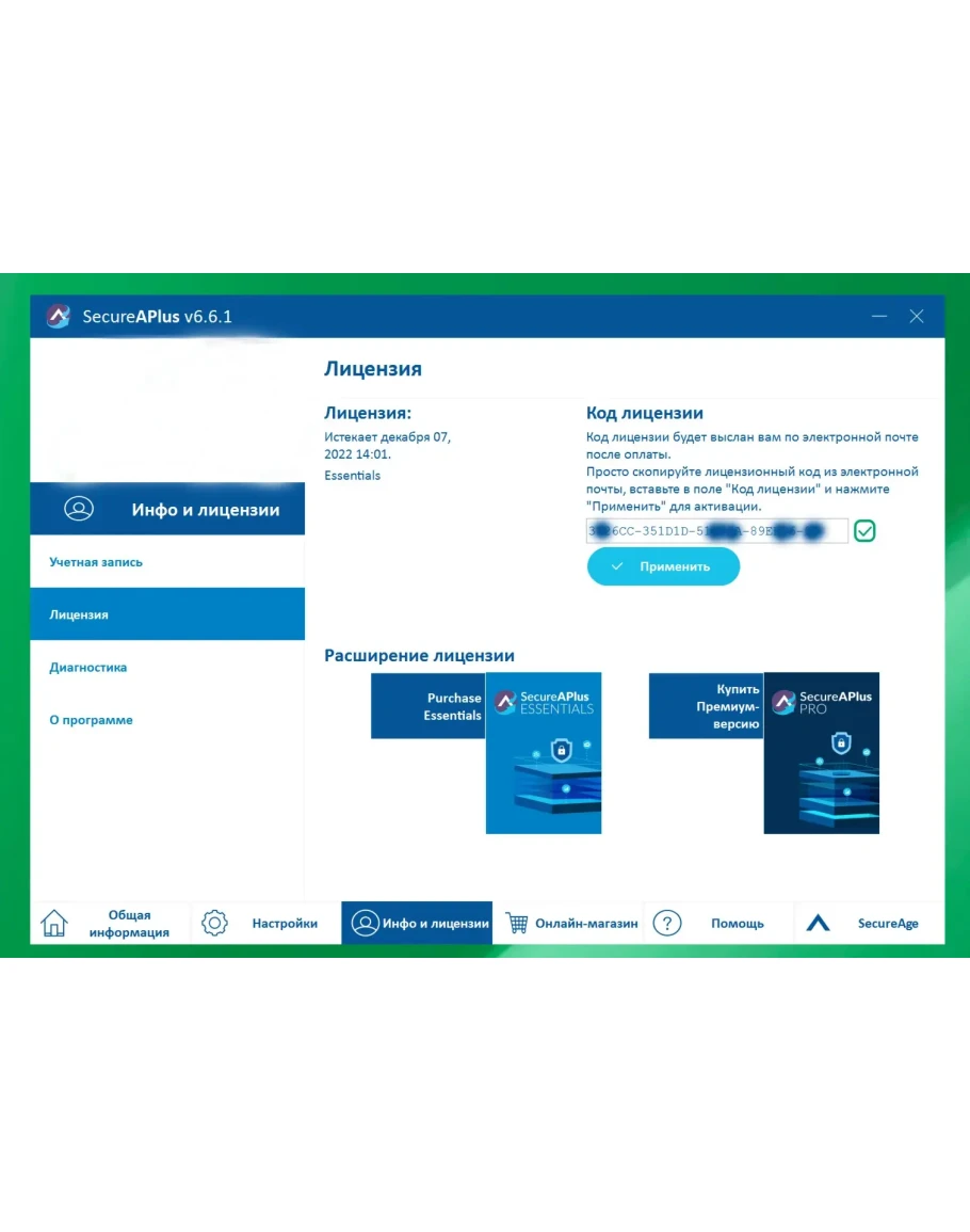 При первой установке SecureAPlus вам автоматически предоставляет пробная версия SecureAPlus Pro на 3 месяца бесплатно. Используя приобретенный код активации, вы перезаписываете пробную 90-дневную версию Pro лицензией Essentials.