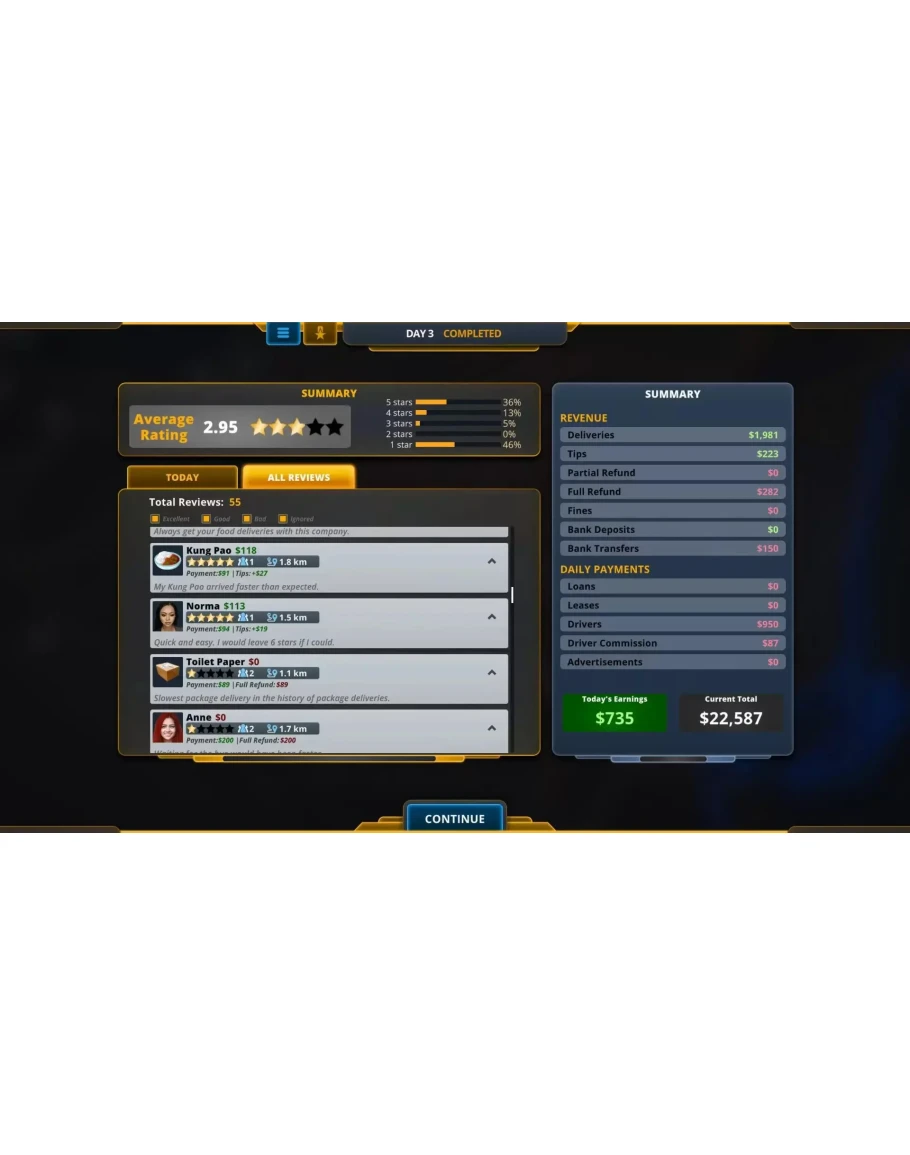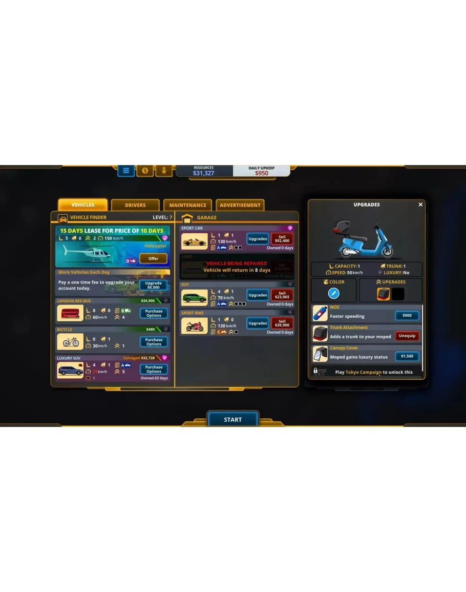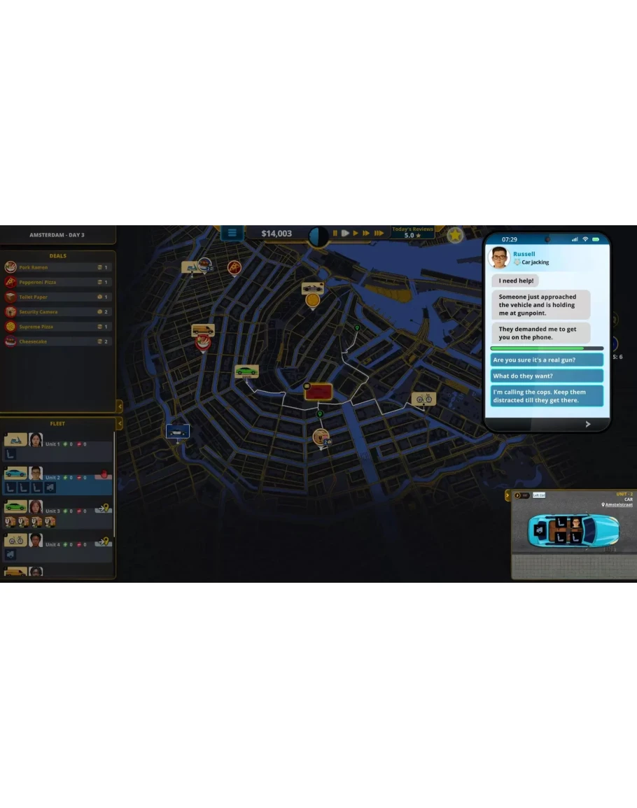 В игре Delivery INC вы берете на себя роль управляющего транспортной компанией. Ваша задача — подбирать пассажиров, посылки и еду и доставлять их, пока терпение клиента не лопнуло. Быстро принимайте решения и эффективно применяйте логику, чтобы справиться с несколькими доставками одновременно. Какого водителя назначить для следующей доставки? Стоит ли ему брать и сдавать заказы по пути? Подберите лучший план и маршрут, чтобы клиентам не пришлось ждать слишком долго. Попав в затруднение, ваши водители-доставщики будут обращаться к вам за помощью. Делайте выбор с умом, чтобы избежать катастрофы, и разрешите ситуацию. Пробуйте разные подходы, достигайте различных результатов и ждите неожиданностей благодаря случайным элементам. Начните бизнес в любом городе, в любой точке мира. Испытайте свои навыки на самых реалистичных дорогах и маршрутах. Каждый город генерируется на основе данных карт реальных городов. Автопарк и водители – ключ к успеху компании. У каждого водителя есть свои черты характера, которые по-разному влияют на эффективность. У каждого транспортного средства есть преимущества и недостатки. Соберите команду, которая лучше всего подойдет для вашей компании и стиля игры. Отзывы сильно влияют на репутацию компании, так что постарайтесь максимально удовлетворить всех заказчиков. Высокий рейтинг обеспечит вам постоянный приток клиентов и доходов, а низкий поставит вашу компанию под угрозу банкротства.