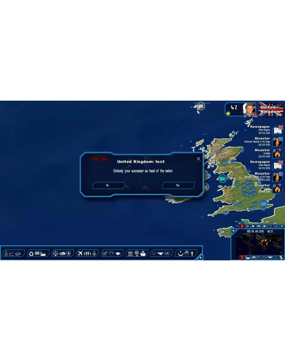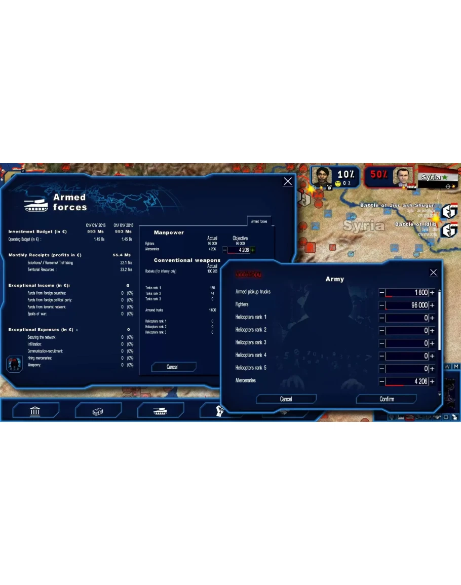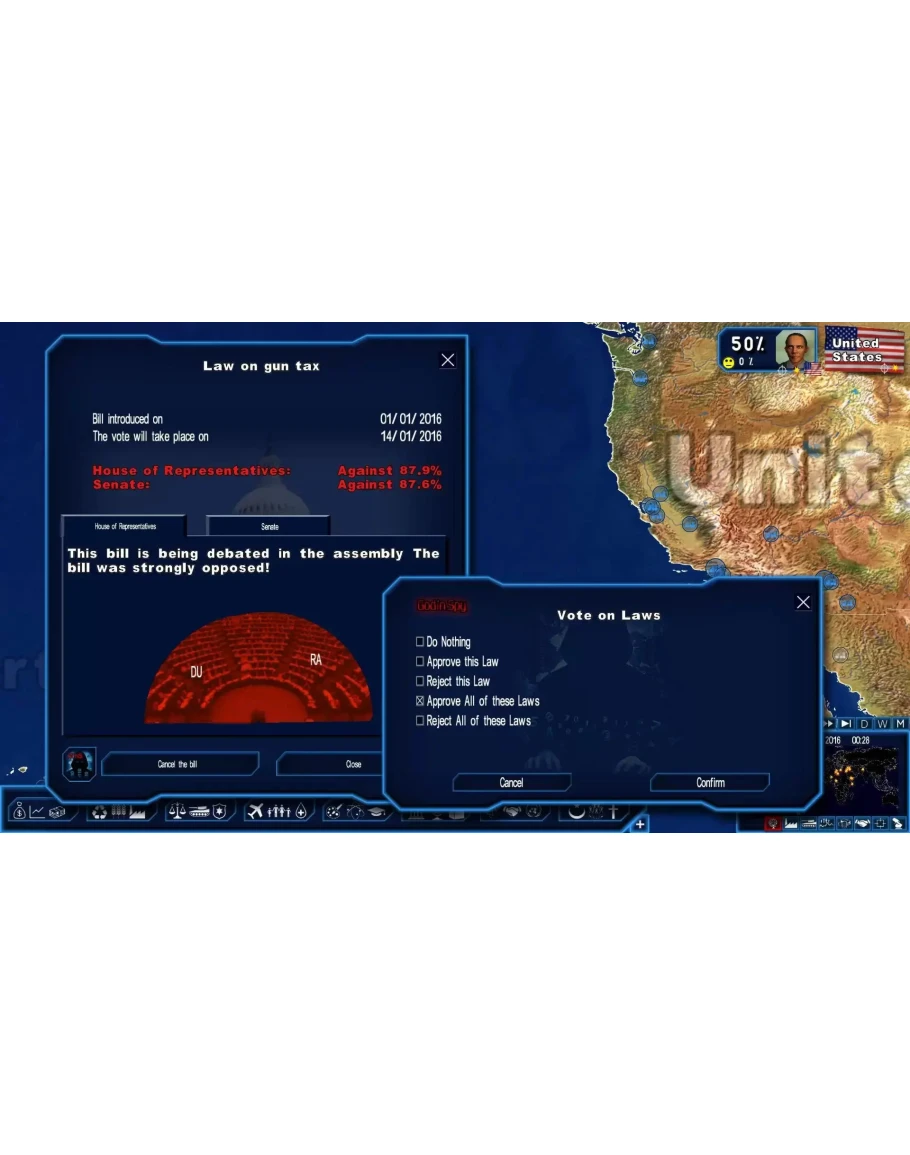 With the God'n'Spy add-on, you can be the master of Power & Revolution and intervene in world events by accessing all the key factors of the game, manipulating them as you see fit and creating or modifying events at any moment! At any moment, by using this game mode, you can access internal hidden game engine variables, you can modify some of these variables and create and delete events. This gameplay mode will also allow you to come back as another character and continue to play if you lose your game. List of variables to explore the ideological alignment between your head-of-state character and your government and your political party your energy level, as perceived by the public the list of themes that you have addressed the political trends of other heads of state the dictatorship level of other states the level of responsibility of belligerent factions involved in conflicts the political leanings and the electoral weight of any character the preferred themes of any character the level of severity of a disaster, disturbance, or terrorist attack the analysis of an economic agreement before its approval detailed electoral results at any time, as if the elections had taken place that very day information on your opponent protest movement popularity levels pertinence level of beginning a protest movement by your party pertinence level of inciting a group to begin a protest movement. if you lose one round, the possibility for continuing the game with the new head of state List of modifiable variables: extraordinary revenues of a state enabling it to dispose of a superior budget your own popularity your health economic and strategic relationships between countries the popularity rate of any character the loyalty of any character in reference to your head-of-state character for any character: their level of experience, charisma, health, positive outlook, and political interest; their moral character, degree of influence, level of protection, and resistance to alcohol rejection or approval of any national bill or UN international resolution proposal the number of military units (for all kinds of arms) the possibility to immediately finalize construction projects the possibility for having immediate success in actions from secret services or agent 001 if you lose one round, the possibility for continuing the game with the new head of state revenue of your legal party or illegal organization the armed forces of your illegal organization the number of rockets and missiles in your legal or illegal army the possibility of finding all the camouflaged rebel camps with your drones the possibility of keeping your camouflaged rebel camps invisible indefinitely the possibility of normalizing your illegal organization. terrorist acts (attacks, hostage taking) List of events to create, terminate, or delete: scandals concerning any character natural disasters disturbances armed conflicts with the choice of the winner and level of responsibility of the belligerent factions terrorist acts (attacks, hostage taking) conflict with terrorist organizations city battles IMPORTANT: this upgrade only runs for owners of a valid and activated activation code of Power & Revolution. Screenshots description: Manipulate the parliament Optimize your protests Enhance your armed forces Put an end to battles Do not lose anymore