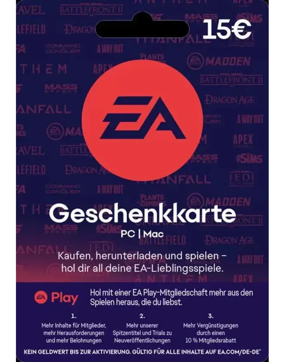 Get great PC games from franchises like The Sims™, Battlefield™, EA SPORTS™ FIFA, Dragon Age™, Need for Speed™, and more! Use this gift card for EA PC purchases, including full games, DLC, & EA Play subscription. Visit ea.com/redeem in your web browser. © 2020 Electronic Arts Inc. EA, the EA logo, Battlefield, Dragon Age, Need for Speed and The Sims are trademarks of Electronic Arts Inc. FIFA is the property of its owner and used with permission. NO VALUE UNTIL ACTIVATED - GOOD FOR ALL CONTENT ON EA.COM* *This EA digital Gift Card (“EA Gift Card”) is issued by EA Swiss Sàrl and redeemable at www.ea.com/redeem for use in EA online Gift Card enabled stores that EA offers from time to time. This card can only be redeemed once. For the redemption of the EA Gift Card, Internet access, the registration of an EA account, EA Wallet and acceptance of EA’s Wallet & Gift Card Terms and Conditions (see www.ea.com/ea-card-terms-and-conditions ), User Agreement and Privacy & Cookie Policy, (see www.ea.com/en-gb ) is required. You can redeem this EA Gift Card only via an EA Wallet in the same currency. You can open, access, and use one EA Wallet so the redemption of EA Gift Cards in more than one currency is not permitted. This card is valid only in the United Kingdom and you must be resident in the United Kingdom. To use your EA Gift Card with your EA account in the United Kingdom you must be at least 13 years of age. If you purchase this EA Gift Card through a retailer, that sale is made by the retailer acting as an agent for and on behalf of EA Swiss Sàrl.