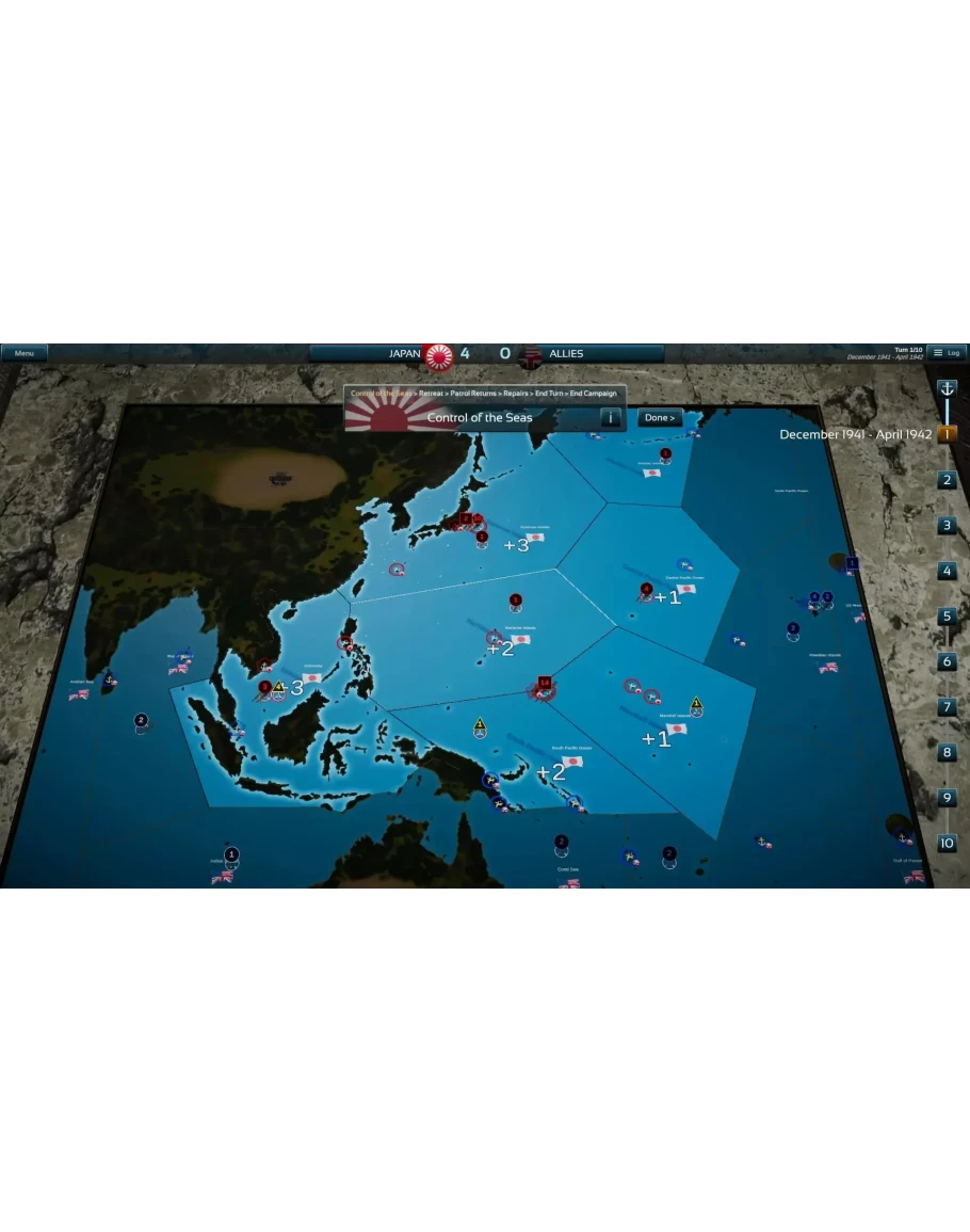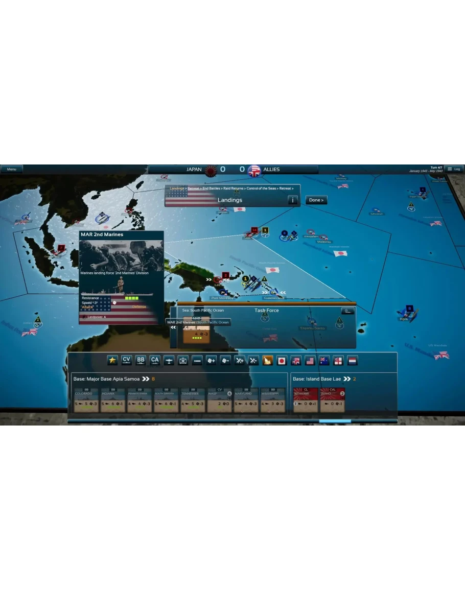 The game is a turn based game, I GO U GO system with alternating phases. You can play hot seat, against the AI or in multiplayer mode. The game contains: a turn-based sequence of play, with US having the slight advantage to play second as they broke the enemy code, allowing for interesting counter-moves, all main battleships, carriers and heavy cruisers as individual units, and minor ships, marines or air units regrouped in groups and flotillas, a simple (but not simplistic) set of game mechanisms, focusing on taking control of key sea areas, straightforward battle mechanisms, handling the various aspects of naval warfare: gunnery exchanges, submarines and airborne attacks, game features day or night battles, island bases invasions, air raids against ports, reinforcements from other theaters of war, a challenging set of decisions each turn for the selection of which areas to keep under your control, seize from the enemy or harass, an AI that will attempt to foil your grand strategic plans or your local actions, a very accurate database with faithful ships sketches, 3D models, and actual historical photos, a streamlined UI and easy controls, and a wealth of ingame information, many scenarios of variable length and difficulty. MORE IN DETAILS GAME SEQUENCE: The game is played in 10 turns of 4 months each, alternating the opposing sides. The US side, playing last, has a slight strategic advantage. GAME OBJECTIVE: Each turn, both sides will attempt to control the key sea areas on the map. Each of those brings Victory Points (VP), not always the same for each side in a given sea, representing the different strategic importance of the various seas to the respective sides. At the end of the turn, once scores have been calculated, the leading side gets the balance and accrued it to its overall score. The winner of the game is the side with a positive VP balance at the end of the scenario in play. GAME PHASES: They are all identical each turn, except when mandated by special case (for instance the surprise attack phase of December 1941 in FC Pacific). In sequence: Arrival of reinforcements in a friendly port, or removal of units if required by date/turn. Moving Patrols out to sea, to take control of the sea areas. Placement of land-based aircrafts, one plane at a time, sides alternating. Only in allowed seas. Those planes can control sea zones. Movement of amphibious units. Placement of the submarine unit (if in game). Raid Missions with the aim of making attacks or defenses in sea areas, but not allowance future control by raiding ships. Resolution of naval battles, in the order selected by the Japanese player, sea area by sea area. Battle sequence is described hereafter. Landing of Marines, if they did not take place during battles. Return to port of all Raid Missions. Check of sea areas control and change of ownership of isolated bases. Return to base of land-based aircrafts and return to port for all patrolling ships. Repair of damaged units in ports. BATTLE PHASES: Each battle follows the same process below, for as long as units of both sides remain in the currently selected sea area: Selection of battle round type, between air and surface. Should the sides disagree, a random selection is made, with various bonus or penalties for air action, area control or admiral’s presence in the sea area. Exchange of fire, air or surface, are simultaneous, although show one side after the other for better presentation aspect and understanding. All units allowed to fire may select only one single valid target per round