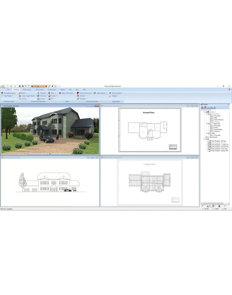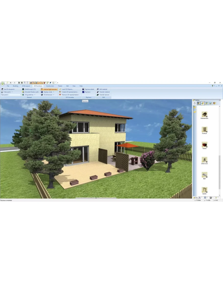 Build and visit your dream house in a few clicks! Home Architect – Design your floor plans in 3D is a professional program for house modeling in 2D and 3D. This complete tool will enable you to create and customize the architecture of your dream house down to the very last detail. The 3D Model engine guarantees a realistic 3D rendering from lighting management according to your location and time, to blueprint import and the ability to simultaneously edit your projects in 2D and 3D! 2D/3D FLOOR PLAN Simultaneous 2D and 3D editing Advanced 3D rendering with lighting management according to your time and location Orientation according to cardinal points for sunshine Raytracing realistic 3D rendering with lighting management BUILDINGS AND ROOFS Dozens of existing projects to get inspired Wall customization according to their type and material Create unlimited floors and buildings: from basement to attic! Complex and customizable roofs Skylight windows, dormers, fireplaces, solar panels… HOUSE ARRANGEMENT Thousands of items and furniture Customize hundreds of existing textures or import your own! Outdoor: patios, conservatories, swimming pools, gazebos, garages, benches, barbecues… Realistic panorama : add your own background pictures for a more authentic rendering PROFESSIONAL TOOLS 2D layout with customizable cross section plans for building permits Surface editor: creation of earthenware, tile, baseboard, border strip surfaces… Customizable staircase with railing and stairwell options Land and terrain editor: creation of pathway, stream, plateau, mound and ditch, height points... Bill of quantities detailed for every room and material 2D plans and 3D images export in .jpg, .png, .bmp and .gif formats TUTORIALS Illustrated guide with a glossary Step by step video tutorials to create your first project in one hour flat!