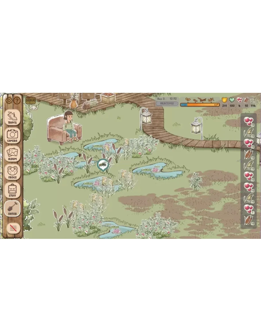 Kamaeru is a cozy frog-collecting game about farming and preserving nature. You play as a kind soul helping an old friend restore the wetlands of your childhood by transforming them into a safe haven for friendly little frogs. With the help of the game’s cast of welcoming NPCs, you will photograph and breed frogs to increase your reputation, decorate your frog refuge, and plant native crops to help your amphibian abode thrive! Collect frogs Feed, breed, collect, and raise all of the game’s 500+ frogs! It’s up to you to figure out the secret to attracting new and adorable frogs. You can complete your collection by unlocking all the rare colors through a special breeding mini-game. When new ones join your refuge, use the in-game camera to take photos of them and collect them for your frogedex! Restore the wetlands In order to succeed in your quest for frog preservation, you will need to restore the nearby wetlands to their former glory. This will allow you to continually support and cultivate the area through a process known as paludiculture! Dig ponds to let water roam the land again and plant native wetlands species to harvest precious crops. From there, you can transform your pickings into manufactured goods that can be sold to improve your froggy habitat further! Customize your frog refuge New furniture will bring new frogs with it! As you personalize your habitat, new poses of frogs will be shown into specific kinds of furniture. Plus, it’ll attract attention to the area–and with it, new visitors! You can even repaint furniture to better fit your own unique style sensibilities. © 2023-2024 HUMBLE REEDS