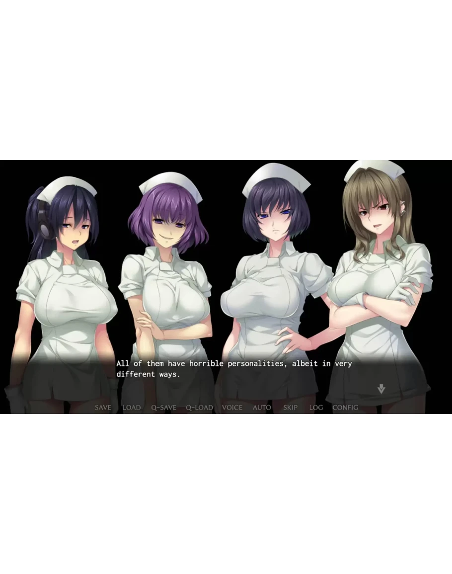 ОСОБЕННОСТИ визуальная новелла о больнице с самыми ужасными медсестрами полностью японская озвучка СЮЖЕТ Встречайте зловещий квартет медсестер, которых боятся даже другие медсестры! «Завистливая медсестра» Тачибана, «Коварная медсестра» Курокава, «Жестокая медсестра» Ямагути и «Демотивирующая медсестра» Хирамацу. Как и ходили слухи, в этой больнице нет ничего, кроме медсестер с худшим характером. Я понятия не имел, что может быть кто-то хуже них! Эти трое не просто отвратительны… Они чистое зло. Некоторые из них одержимы, некоторые злы, а третьи непредсказуемы. Они самые худшие – и именно это делает их лучшими! История, набирающая обороты! Блин, все, что я сделал, это сломал несколько костей и попал в больницу. И все же все относятся ко мне как к последнему отбросу! Плюс, в последнее время дела здесь идут неважно. Как будто над тобой нависает темная туча, куда бы ты ни пошел… Основной цикл игрового процесса заключается в том, что эти ужасные медсестры снова и снова доставляют неприятности главному герою Ямаде. Но они очень креативны, поэтому история никогда не устареет — и на этот раз история, которая ждала своего часа, наконец-то выходит на первый план.