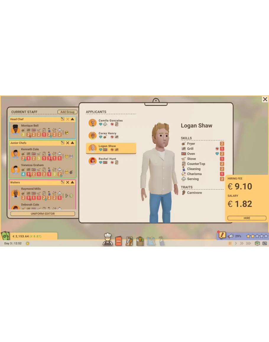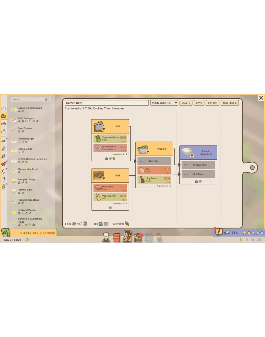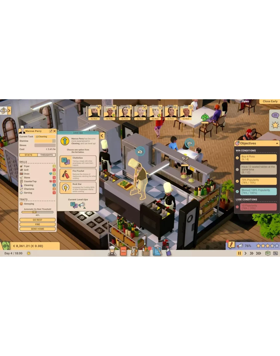 Recipe for Disaster is a management game that challenges you to create and run a highly successful restaurant. Whether turning around the fortunes of failing establishments in pre-set scenarios, or bringing your own vision to life in freeplay mode, you’ll be carefully designing restaurants, hiring and managing the right staff, customizing food menus, and experimenting with ingredients to invent tasty new dishes that will impress your customers. Sounds idyllic, right? Wrong. Blazing a trail through the hectic and stress-inducing world of the food-service industry will be anything but straightforward. After all, this is an industry built around people, and keeping everyone happy, motivated and fulfilled will require nothing short of a miracle! Serious personality flaws and major skill gaps within your team could really disrupt the flow of service, while the volatile attitudes and peculiar tastes of your customers may prove to be the barrier that separates you from those all-important positive review scores. With perseverance, savvy management and a great deal of compromise, your restaurant will grow, opening up new opportunities and challenges as you attract ever more customers, health inspectors and food critics through your doors. Expand your premises, improve your staff, and walk the precarious line between gastronomic glory and restaurant ruin. Pick from a pool of procedurally generated hopefuls. Consider each individual’s unique combination of traits and skill levels, and how these might affect their work efficiencies, behaviour and customer interactions. Will they excel? Or will they prove to be more trouble than they’re worth? Manage your team’s mood and stamina levels to minimize the risk of breakdowns and mid-service walkouts. Some staff will love the tasks that you give them, while others will loathe them! Customize the design and layout of your restaurants using intuitive building tools. Equip your kitchen with state-of-the-art appliances, decorate your dining area, landscape your surroundings, and build storage to hold those precious ingredients. Manually assign tasks to your team or keep everyone busy using a highly customisable priority system. Keep a close eye on incoming customer orders and adjust your strategy in real-time to ensure the highest standard of food and customer service. Pay close attention to the demands of your customers and adjust your menu to match their tastes. Be wary of dietary requirements, food allergies and unusual preferences. Decide how best to deal with the requests and complaints of your staff and customers. Will you be sympathetic or combative? Pushovers and tyrants will soon find themselves out of business, so you’ll have to read each situation carefully. Use the powerful recipe editor to freely create original recipes and add them to your menus. Ensure you have the necessary ingredients by keeping on top of your storage levels and placing regular orders with your suppliers. Kasedo Games is a division of Kalypso Media Group. Kasedo Games copyright © 2021 Kalypso Media Group All rights reserved. All other logos, copyrights and trademarks are property of their respective owner.
