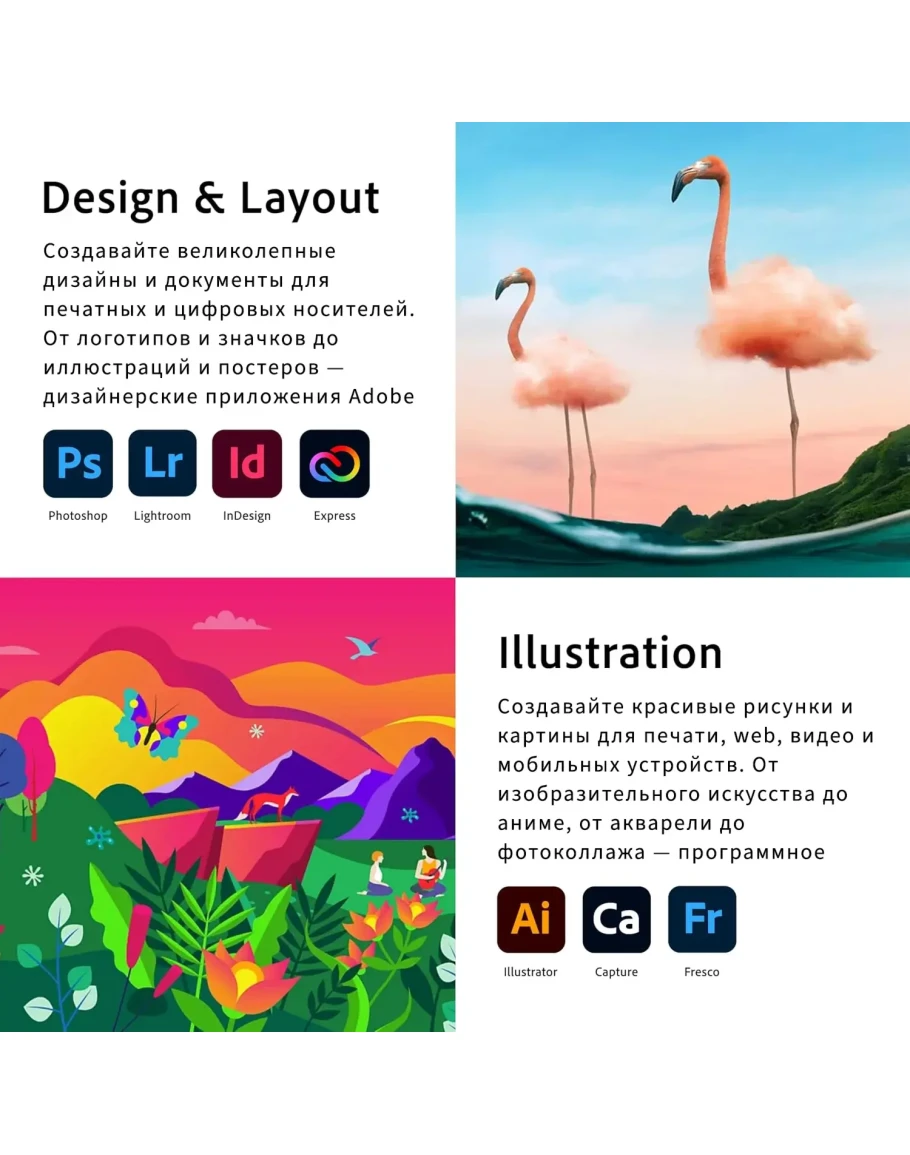 📋Примерный список программ:Photoshop, Photoshop Beta, Firefly, Adobe Lightroom, Adobe Lightroom Classic, Illustrator, InDesign, Adobe XD, Premiere Pro, After Effects, Dreamweaver, Adobe Dimension, Muse, Animate, Acrobat DC Pro, Audition, InCopy, Illustrator на iPad, Prelude, Acrobat DC Standard, Photoshop на iPad, Adobe Photoshop Express, Premiere Rush Mobile, Edge Code, Acrobat Reader, Scout, Spark Page, Spark Video, Adobe Media Encoder, Flash Builder, Edge Reflow (Preview), и другие
