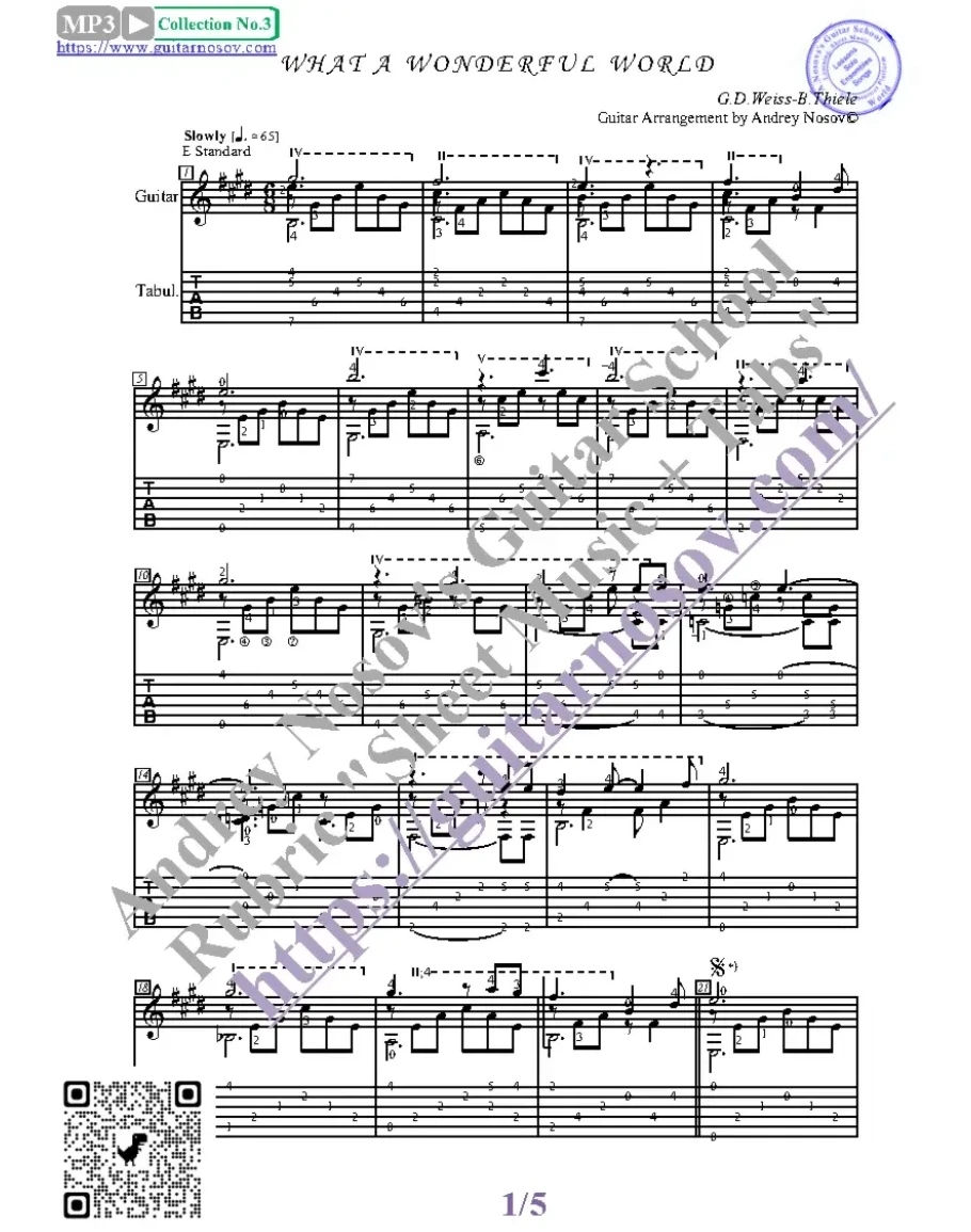 Кликните "Подробнее" для получения дополнительной информацииВашему вниманию предлагается композиция "What a Wonderful World (G.D.Weiss-B.Thiele)", предназначенная для исполнения на 6-ти струнной гитаре СОЛО. Запись выполнена нотами, сопровождена подробнейшей аппликатурой и продублирована табулатурой.