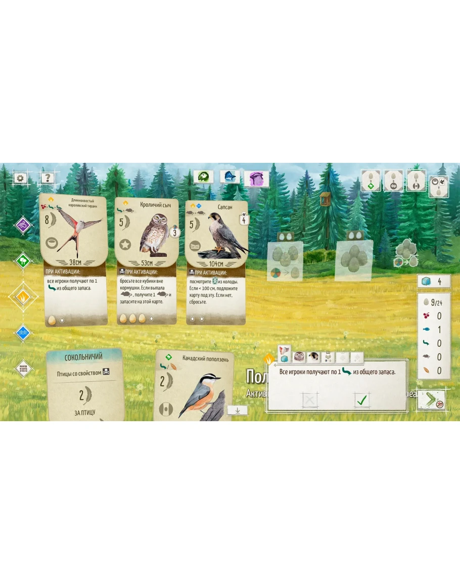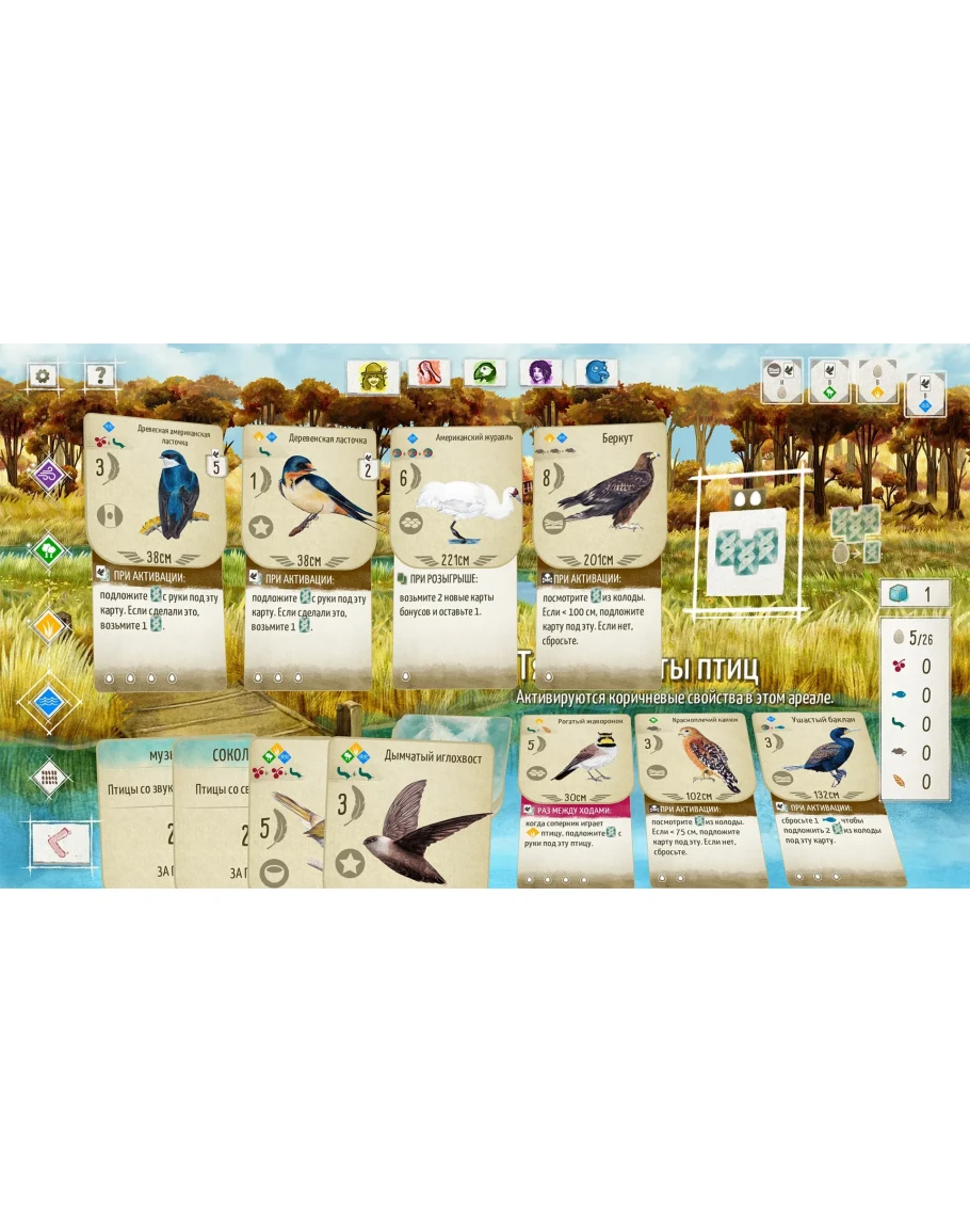 Wingspan (Крылья) — стратегическая карточная игра про птиц, предназначенная для 1–5 игроков. Это официальное цифровое издание одноименной настольной игры, получившей престижную немецкую премию Kennerspiel des Jahres как лучшая игра 2019 года.