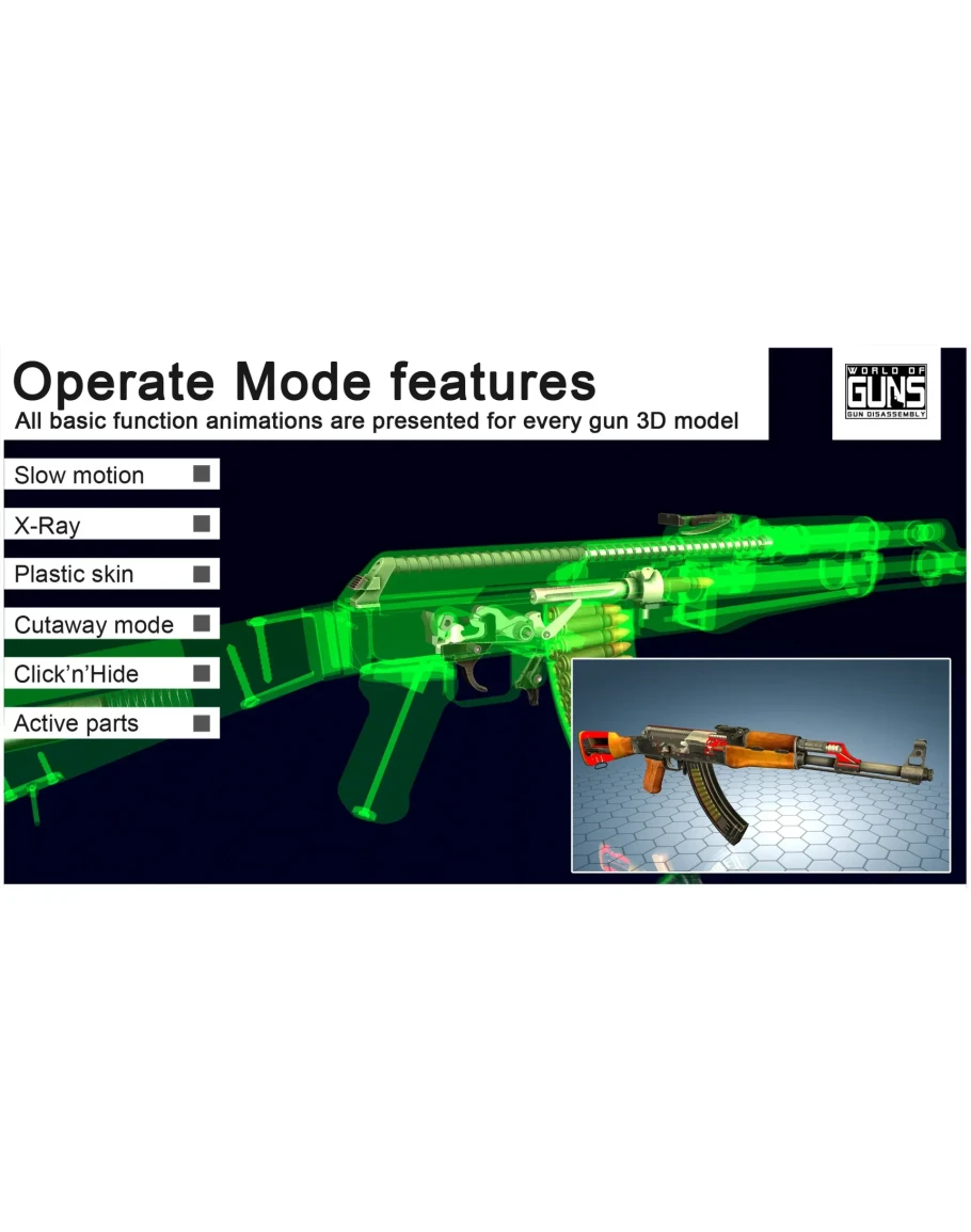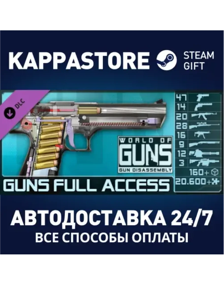 'Guns Full Access' DLC дает доступ ко всем существующим и всем будущим моделям оружия к 'World of Guns: Gun Disassembly'.Все 3D модели с высокой детализацией и с максимальным количеством деталей. Каждая модель может быть разобрана/собрана вручну (пошагово).