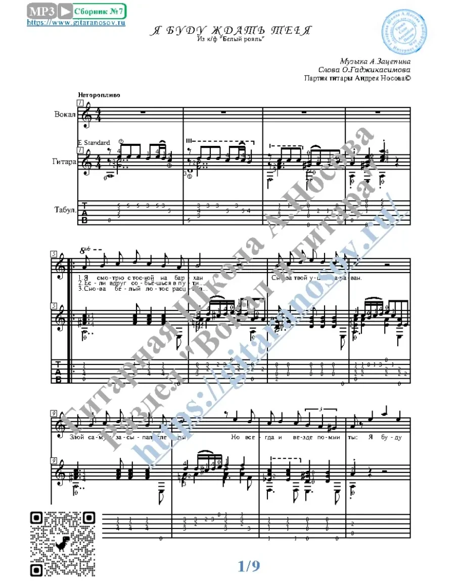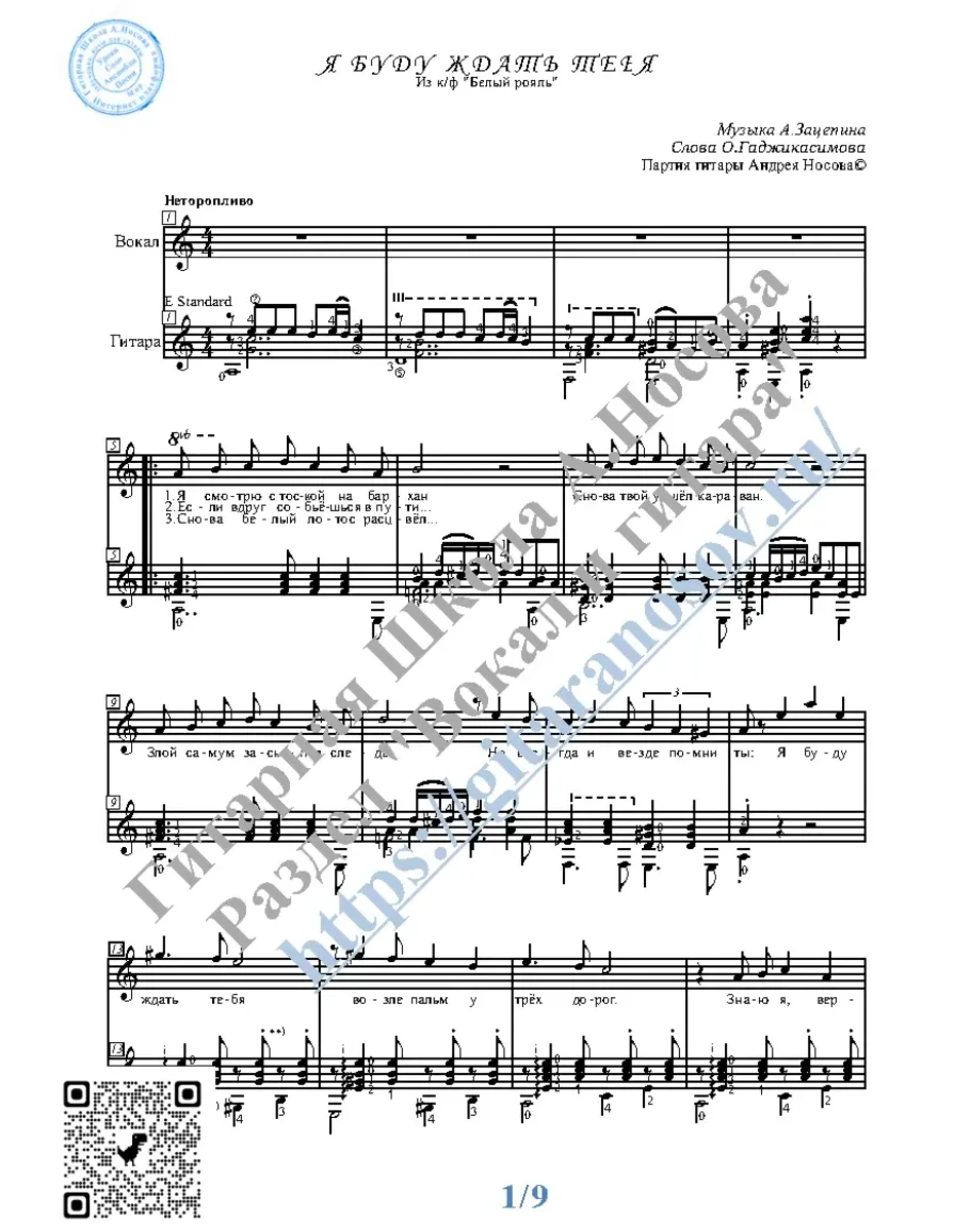 Кликните "Подробнее" для получения дополнительной информацииВашему вниманию предлагается композиция "Я буду ждать тебя (муз.А.Зацепина, сл.О.Гаджикасимова)", предназначенная для вокала в сопровождении 6-ти струнной гитары. Запись выполнена нотами и включает в себя партию вокала с подтекстовкой, партию гитары с подробнейшей аппликатурой и текст песни (НА РУССКОМ).