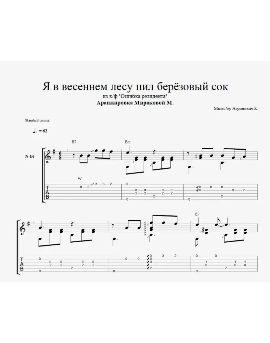 Аранжировка для шестиструнной гитары от Марины Мираковой на музыку из х/ф "Ошибка резидента". Композитор Евгений Данилович Агранович.
