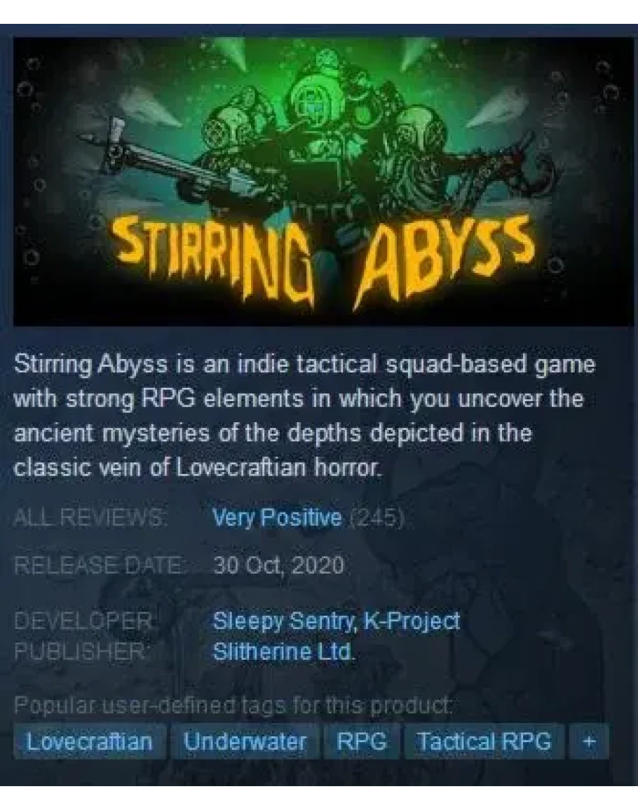 Stirring Abyss is an indie tactical squad-based game with strong RPG elements in which you uncover the ancient mysteries of the depths depicted in the classic vein of Lovecraftian horror.