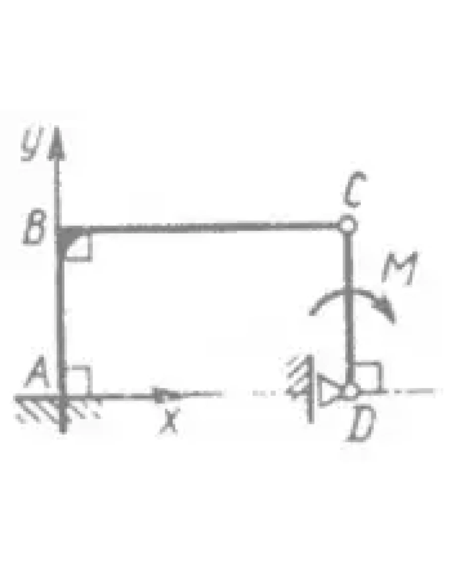 Стержни АВС и CD соединены между собой шарниром С. На стержень CD действует пара сил с моментом M = 400 Н*м. Определить составляющую Xc реакции шарнира С, если длина CD = 2 м.