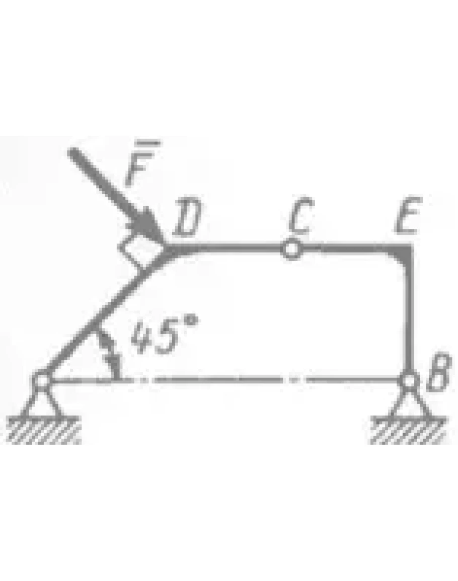Определить вертикальную составляющую реакции в шарнире В, если сила F = 850 Н, а размеры DC = CE = DE.