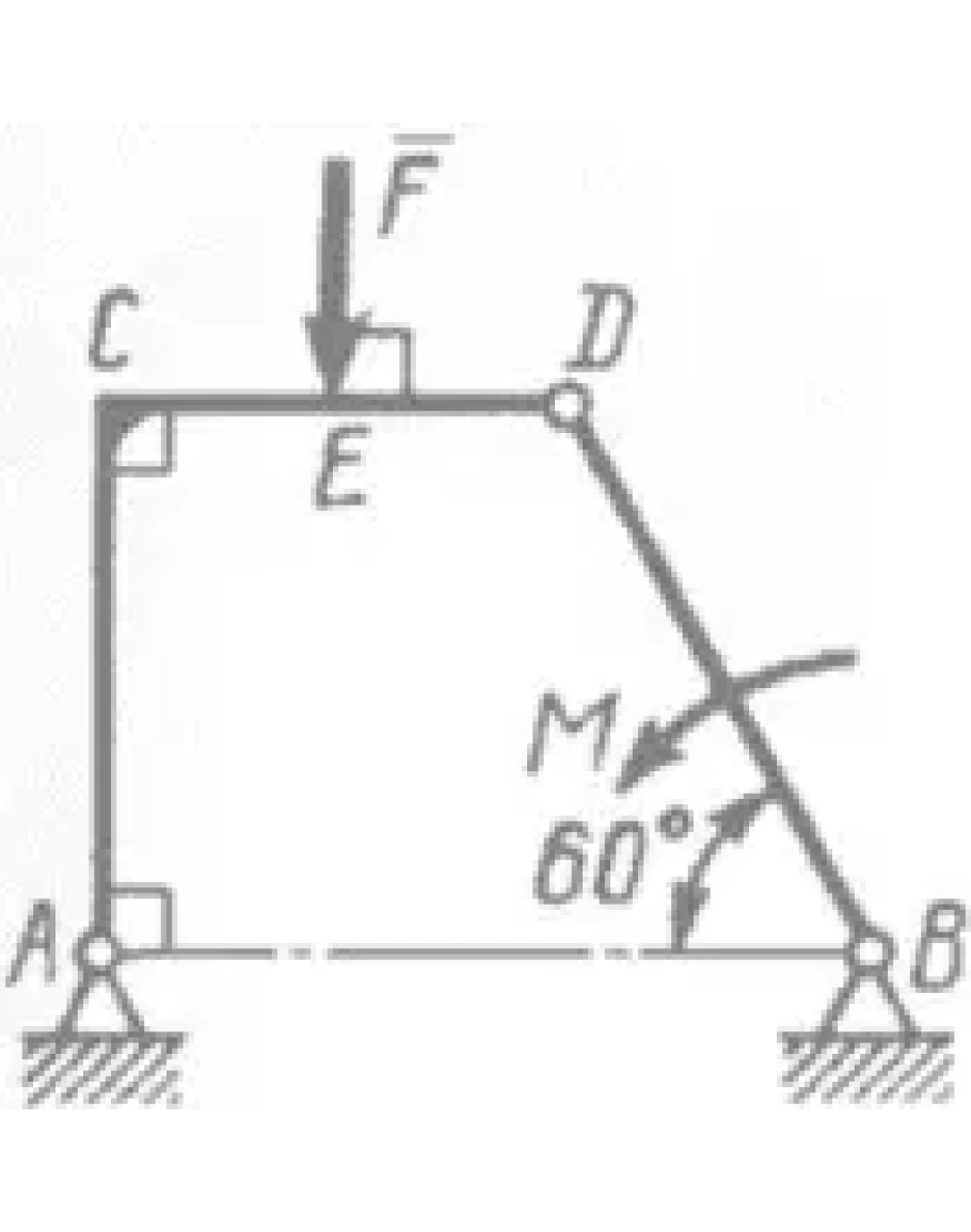 Определить в кН силу F, при которой вертикальная составляющая реакции в шарнире А равна 9 кН, если размеры АВ = ВД = 1 м, СЕ = ДЕ, момент пары сил М = 6 кН*м.