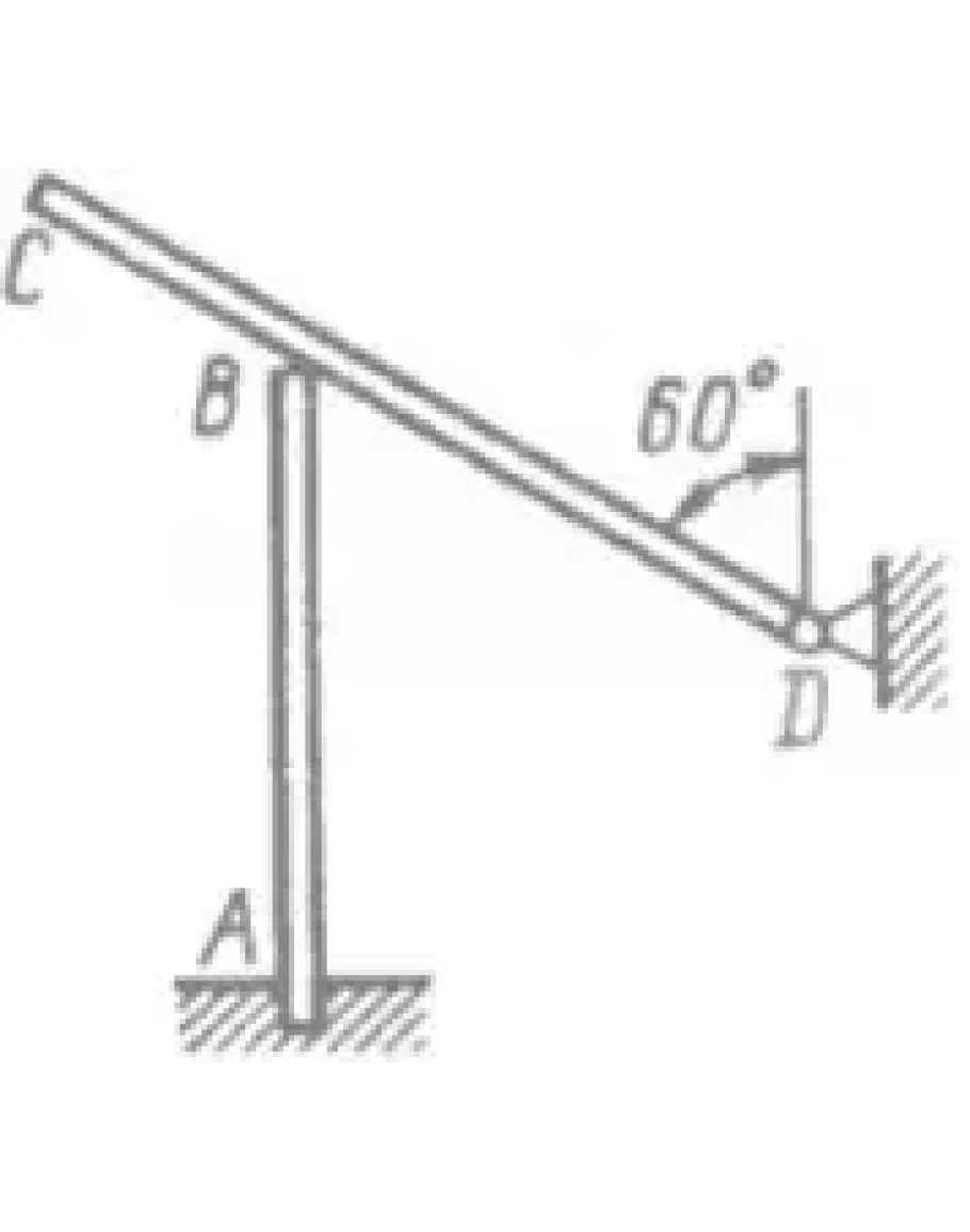 Однородный стержень СД весом 346 Н опирается на вертикальную стойку АВ. Определить момент в заделке А, если размеры ВД = 2 м, ВС = 1 м, АВ = 2 м.