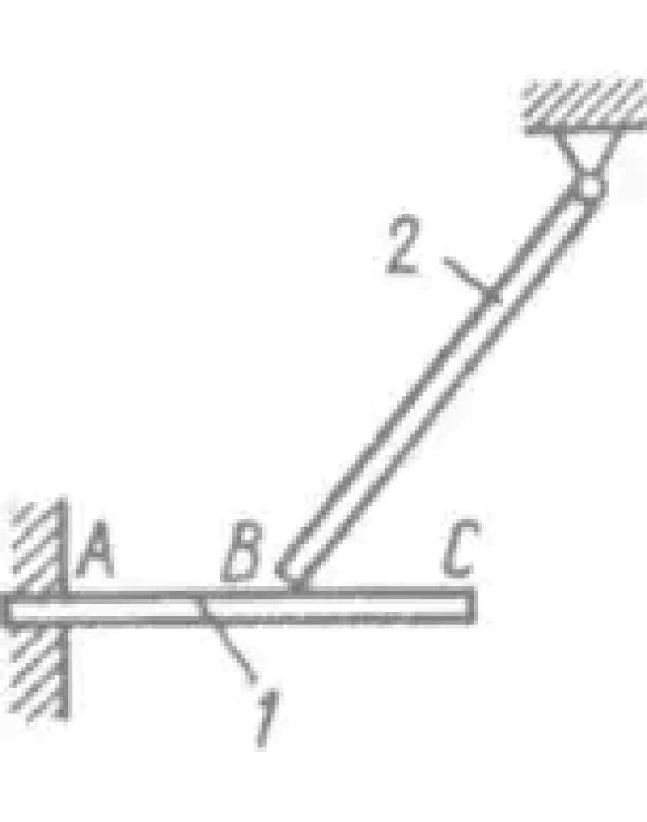 Однородный брус 2 весом 400 Н свободно опирается в точке В на однородную балку 1. Чему должен равняться вес балки 1, для того чтобы момент в заделке А был равен 265 Н*м, если размеры АВ = 1 м, ВС = 0,8 м.