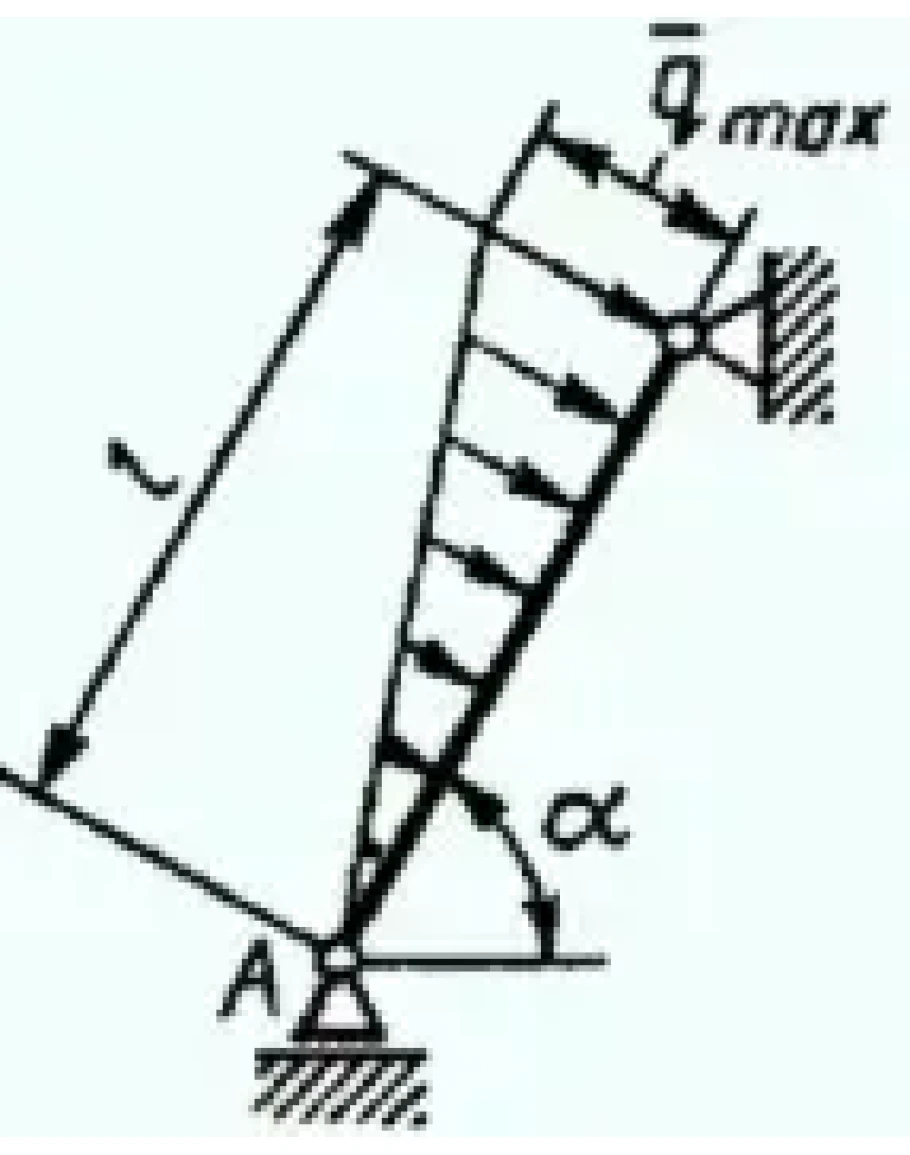 Определить реакцию опоры А, если длина балки l = 0,3 м, интенсивность распределенной нагрузки qmax = 20 Н/м, угол α = 60°.