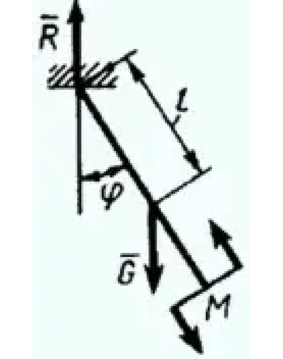 Маятник находится в равновесии под действием пары сил с моментом М = 0,5 Н*м и второй пары сил, образованной весом G и опорной реакцией R. Найти значение угла ф отклонения маятника в градусах, если G = 10 Н и расстояние l = 0,1 м.