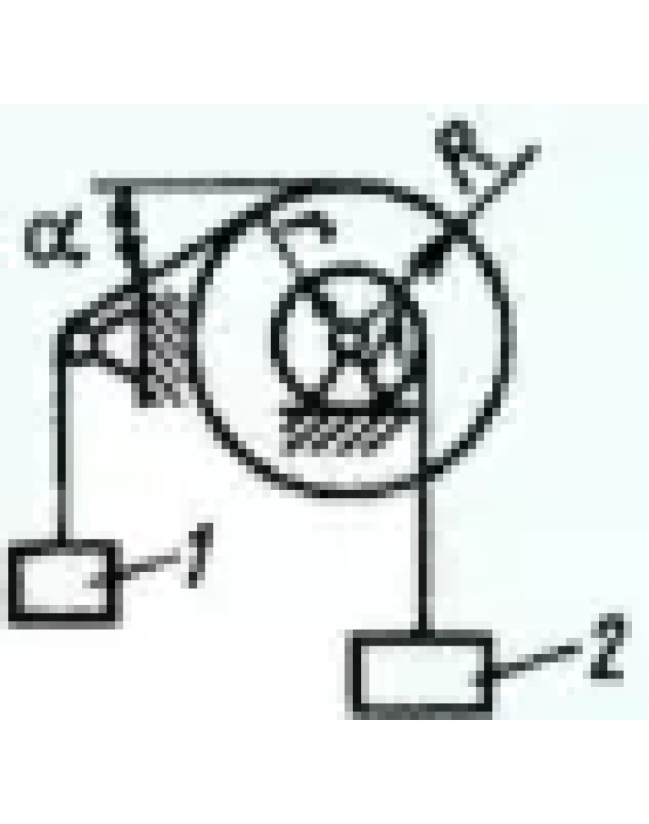 Грузы 1 и 2 висят на канатах, намотанных на ступенчатый барабан. Определить в кН вертикальную составляющую реакции шарнира А, если радиус R = 2r, угол а = 30°, вес груза 1 равен 20 кН. Система находится в равновесии.