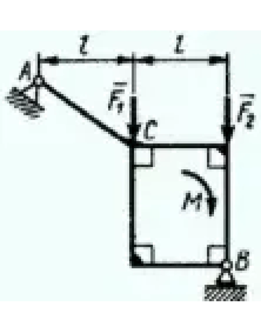 Стержень АС жестко связан с рамой. Определить в кН реакцию опоры В, если силы F1 = F2 = 20 кН, момент пары сил М = 80 кН*м, расстояние l = 2 м.