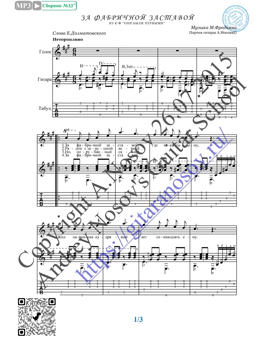 Кликните "Подробнее" для получения дополнительной информацииВашему вниманию предлагается композиция "За фабричной заставой (муз.М.Фрадкина, сл.Е.Долматовского)", предназначенная для вокала в сопровождении 6-ти струнной гитары (pdf / png*). Запись выполнена нотами и включает в себя партию вокала с подтекстовкой, партию гитары с подробнейшей аппликатурой, текст песни (НА РУССКОМ ЯЗЫКЕ). Партия гитары продублирована табулатурой. Прилагается ссылка на скачивание mp3.