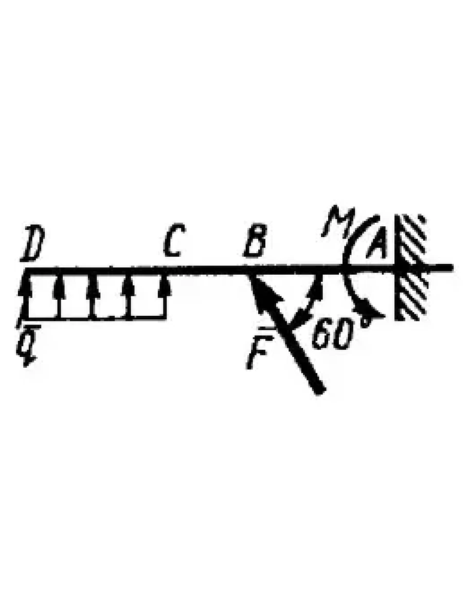 Определить интенсивность q распределенной нагрузки, при которой момент в заделке А равен 546 Н*м, если сила F = 173 Н, момент пары сил М = 42 Н*м, размеры АВ = СD = 2м, ВС= 1 м.