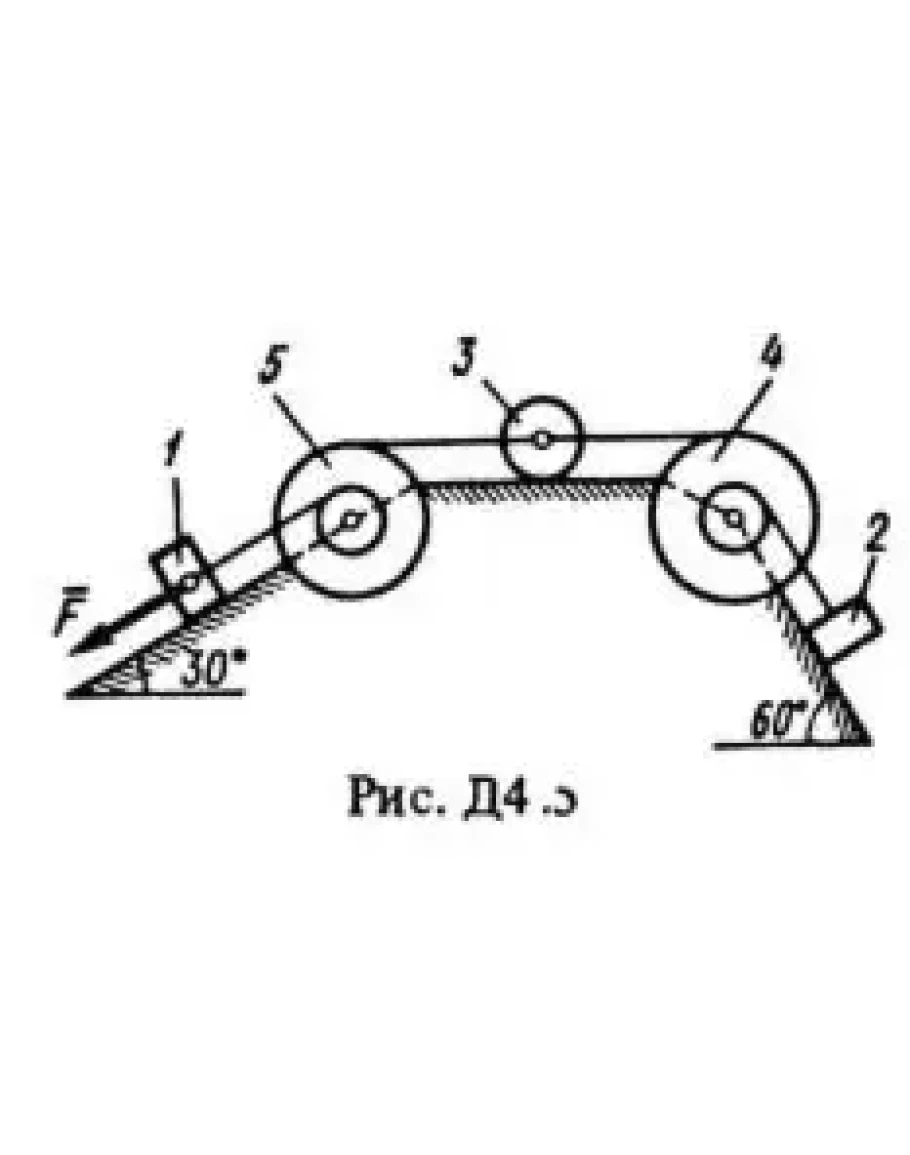 Механическая система состоит из грузов 1 и 2 (коэффициент трения грузов о плоскость f = 0,1), цилиндрического сплошного однородного катка 3 и ступенчатых шкивов 4 и 5 с радиусами ступеней R4 = 0,3 м, r4 = 0,1 м, R5 = 0,2 м, r5 = 0,1 м (массу каждого шкива считать равномерно распределенной по его внешнему ободу) (рис. Д4.0-Д4.9, табл. Д4). Тела системы соединены друг с другом нитями, намотанными на шкивы; участки нитей параллельны соответствующим плоскостям.
