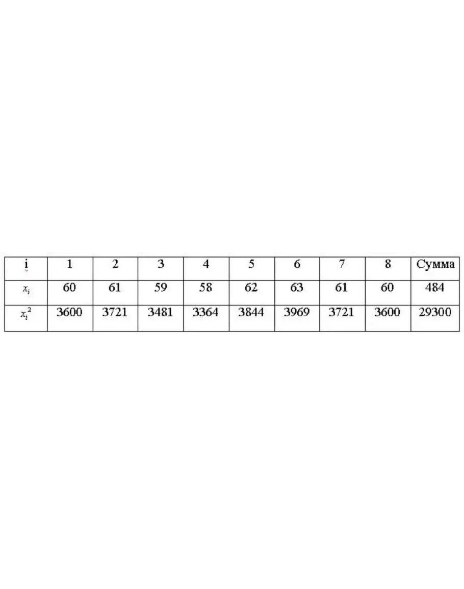 При подконтрольной эксплуатации восьми (n = 8) однотипных автомобилей получены следующие значения путевого расхода топлива х (л/100 км пути): х = (60, 61, 59, 58, 62, 63, 61, 60). Определить выборочные среднее арифметическое X, дисперсию S2, среднее квадратичное отклонение S и коэффициент вариации V случайной величины х.