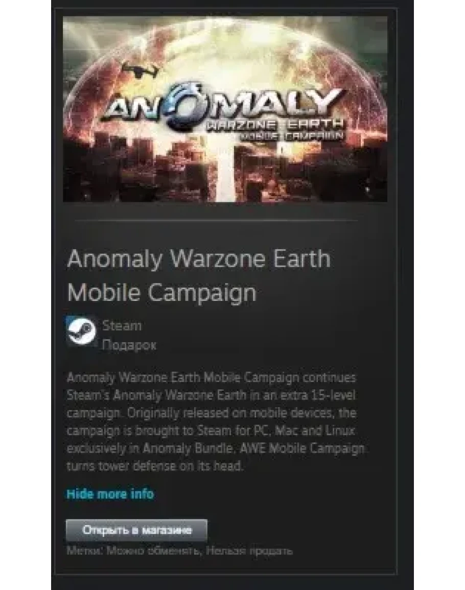 Мобильная кампания Anomaly Warzone Earth продолжает 15-уровневую кампанию Steam Anomaly Warzone Earth. Первоначально она была выпущена для мобильных устройств, но теперь доступна в Steam для ПК, Mac и Linux исключительно в комплекте Anomaly.