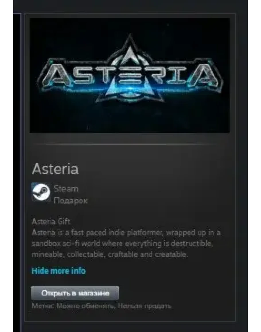 Asteria - это быстро развивающийся инди-платформер, действие которого разворачивается в научно-фантастическом мире-песочнице, где все можно разрушить, добыть, собрать, обработать и создать заново. Вы играете за Райкера: единственного выжившего человека-колониста после того, как ваш народ был уничтожен местными пришельцами. Теперь вы застряли на Астерии, и у вас нет возможности сбежать. Речь идет не только о выживании, но и о мести. Постройте свое безопасное убежище и отправляйтесь на поиски инопланетян, уничтоживших вашу колонию.