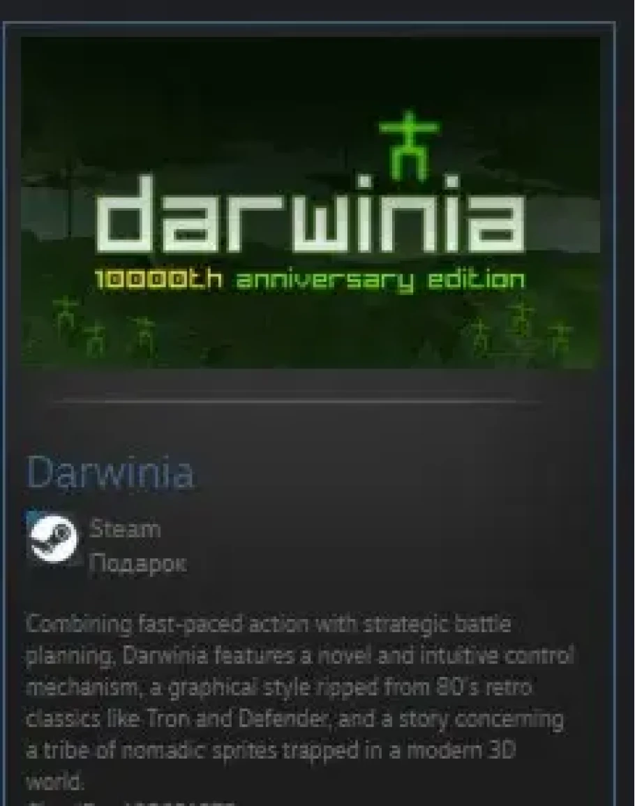 Сочетая стремительный экшен со стратегическим планированием сражений, Darwinia обладает новым интуитивно понятным механизмом управления, графическим стилем, заимствованным из ретро-классики 80-х, таких как Tron и Defender, и историей о племени спрайтов-кочевников, оказавшихся в современном 3D-мире.