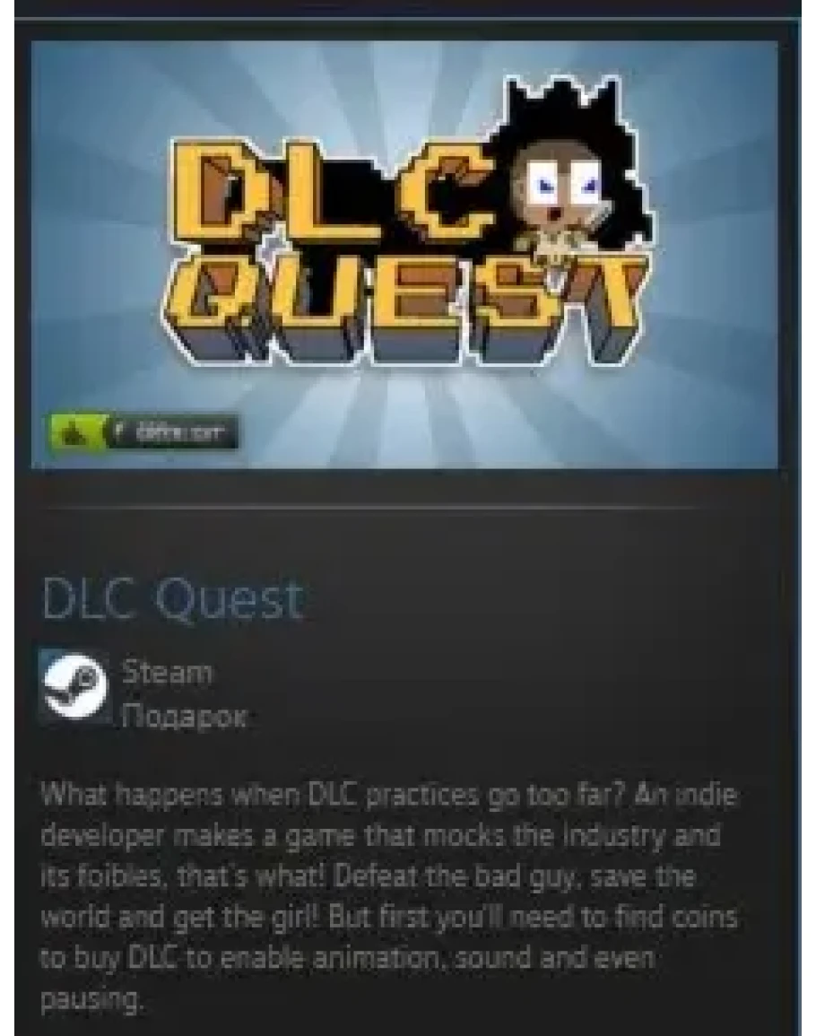 Что происходит, когда практика создания дополнений заходит слишком далеко? Независимый разработчик создает игру, которая потрясает индустрию и ее недостатки, вот что! Победите плохого парня, спасите мир и получите девушку! Но сначала вам нужно будет найти монеты, чтобы купить дополнение, которое включит анимацию, звук и даже паузу.