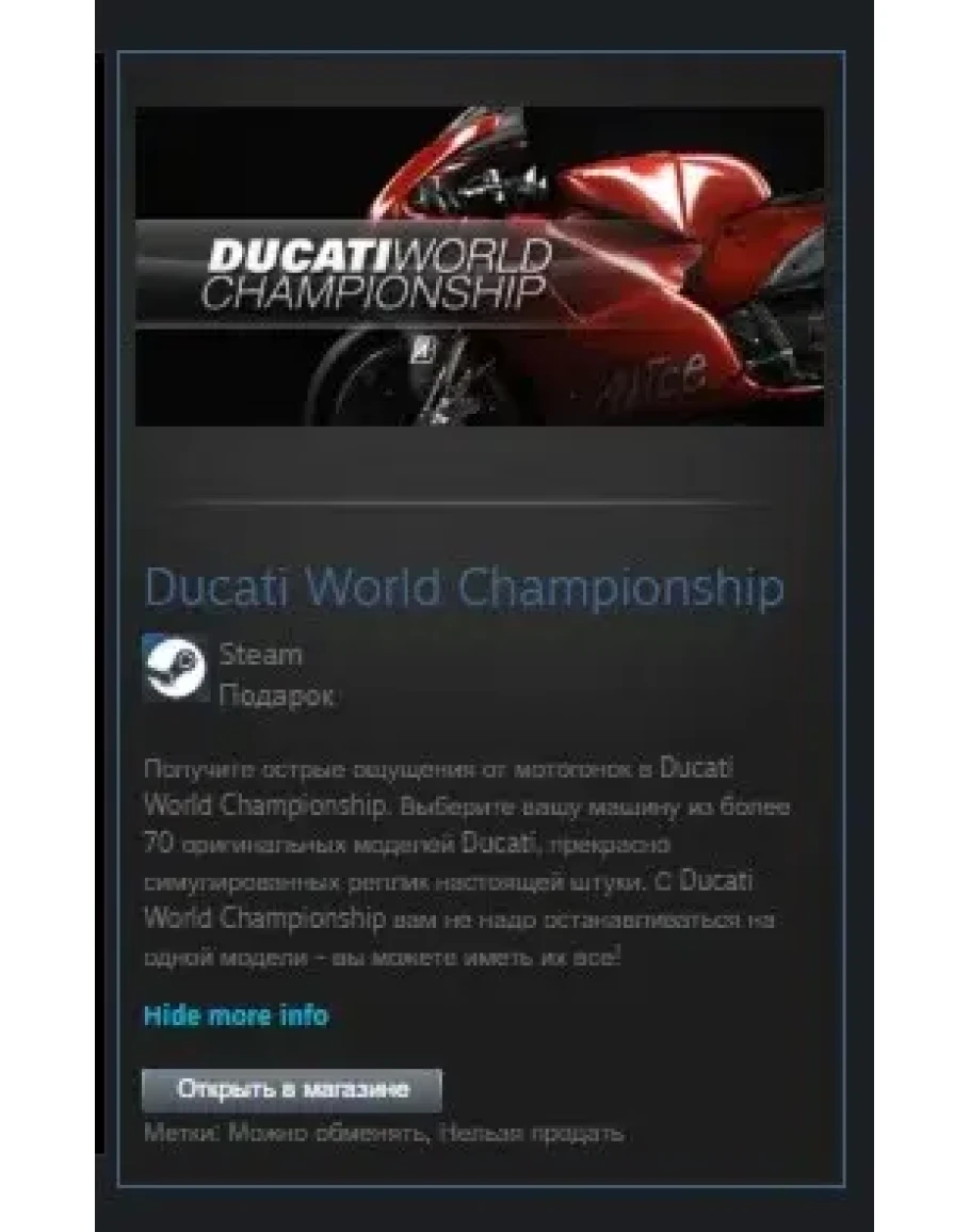 Получите острые ощущения от мотогонок в Ducati World Championship. Выберите вашу машину из более 70 оригинальных моделей Ducati, прекрасно симулированных реплик настоящей штуки. С Ducati World Championship вам не надо останавливаться на одной модели - вы можете иметь их все!