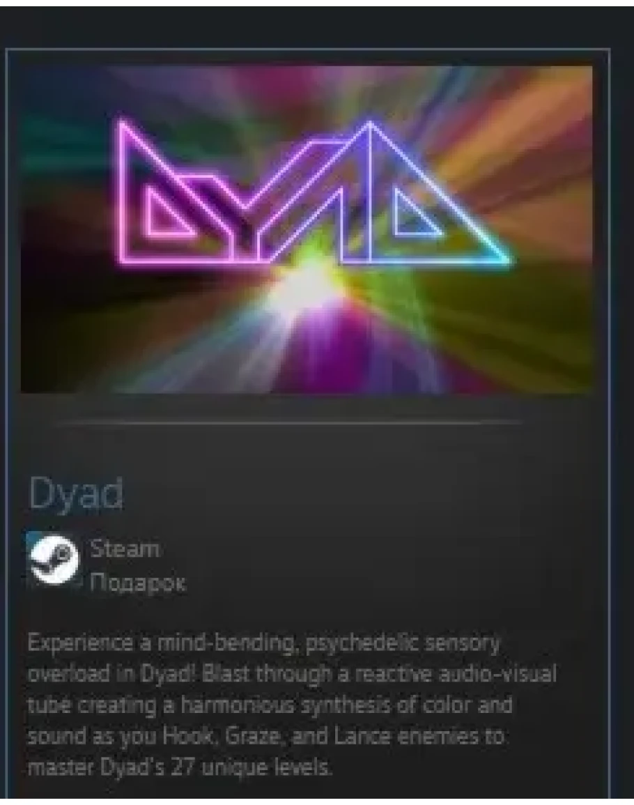 Испытайте умопомрачительную психоделическую сенсорную перегрузку в Dyad! Взрывайтесь с помощью реактивной аудиовизуальной трубки, создающей гармоничный синтез цвета и звука, пока вы цепляете, задеваете и пронзаете копьями врагов на протяжении 27 уникальных уровней Dyad.