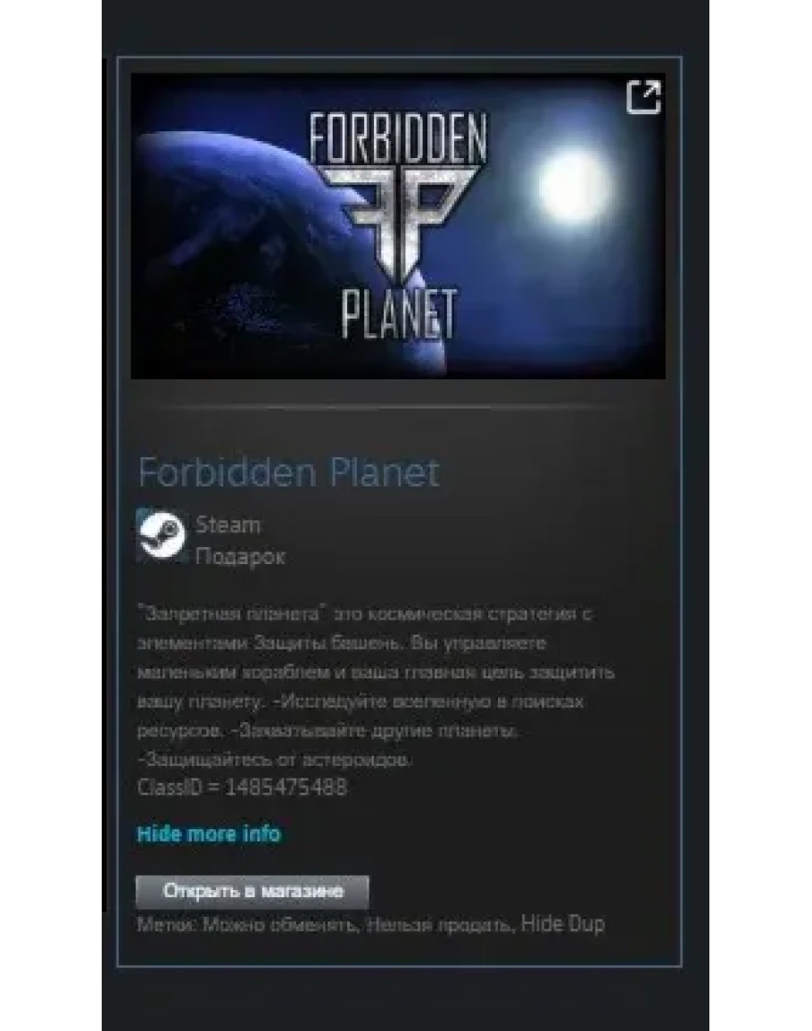 "Запретная планета" это космическая стратегия с элементами Защиты башень. Вы управляете маленьким кораблем и ваша главная цель защитить вашу планету. -Исследуйте вселенную в поисках ресурсов. -Захватывайте другие планеты. -Защищайтесь от астероидов.