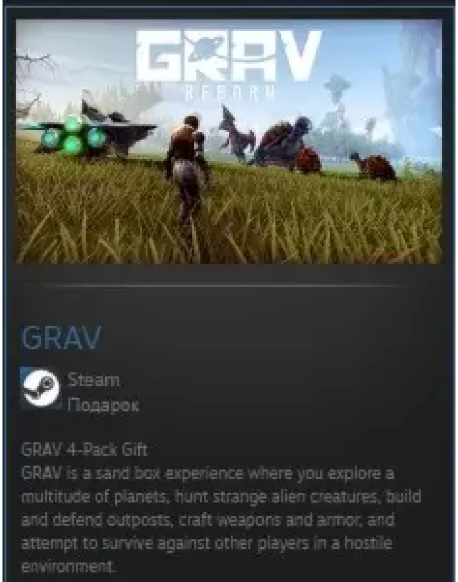 GRAV - это игра в жанре песочницы, в которой вы исследуете множество планет, охотитесь на странных инопланетных существ, строите и защищаете аванпосты, создаете оружие и броню и пытаетесь выжить во враждебной среде против других игроков.