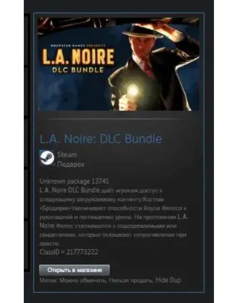 L.A. Noire DLC Bundle даёт игрокам доступ к следующему загружаемому контенту:Костюм «Бродерик»Увеличивает способности Коула Фелпса к рукопашной и поглощению урона. На протяжении L.A. Noire Фелпс сталкивается с подозреваемыми или свидетелями, которые оказывают сопротивление при аресте.