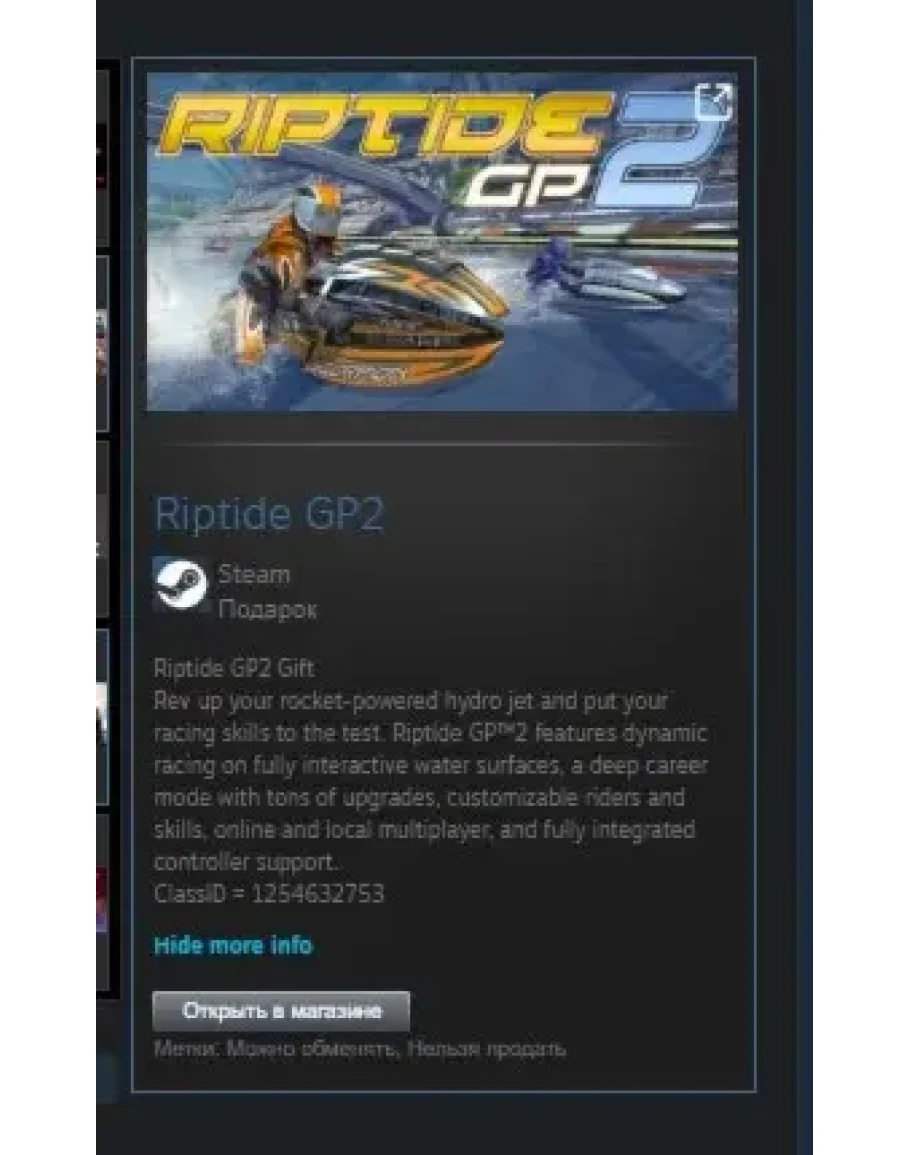 Заводите свой реактивный гидроцикл и проверьте свои гоночные навыки. Riptide GP™2 предлагает динамичные гонки на полностью интерактивных водных поверхностях, глубокий режим карьеры с множеством улучшений, настраиваемые гонщики и навыки, многопользовательский режим онлайн и локально, а также полностью интегрированную поддержку контроллера.